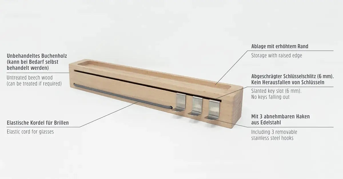 Das Schlüsselbrett mon.key von Sanni Shoo überzeugt mit grossem Nutzen auf kleinem Raum. Mit den Massen 32 x 4,8 x 5 cm erfüllt es mehrere Funktionen: SCHLÜSSELHALTER UND INNOVATIVER SCHLÜSSELSCHLITZ Die Schlüsselleiste mon.key hat über die gesamte Länge (32 cm) einen Schlüsselschlitz, der (anders als andere Schlüsselboards) schräg eingearbeitet ist. Schlüssel können daher nicht herausfallen. BRILLENHALTER Suchen Sie auch öfters nach der Brille oder Sonnenbrille? Auf mon.key erhält sie endlich einen sicheren und fixen Platz. Die eingearbeitete elastische Kordel fungiert als Billen-Halterung, und ist in 3 stylischen Farben erhältlich. ABLAGE UND AUFBEWAHRUNG Schnell das Handy ablegen beim Gehen? Ein sicherer Platz für die AirPods oder andere Kopfhörer gesucht? Münzen schnell zur Hand? Mit erhöhtem Rand fungiert unsere Holzleiste perfekt als Ablage an der Wand. VOLLE FLEXIBILITÄT: EINFACHE MONTAGE UND ABNEHMNBAREN HAKEN Je nach Einsatz hält das Schlüsselbrett mon-key.me Haken aus Edelstahl bereit: Diese können für Schlüssel verwendet werden, aber auch für Dinge wie Regen-Knirps oder Hundeleine. Genauso einfach wie die Montage: Die Schlüsselleiste wird mit Bohrvorlage und 2 passenden Schrauben und Dübel geliefert.
