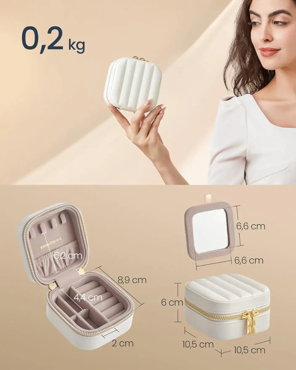 SONGMICS HOME ANAH Schmuckkästchen Reise – 10,5 × 10,5 × 6 cm, mit Spiegel, Reissverschluss & flexibler Innenaufteilung, PU-Leder weiss
