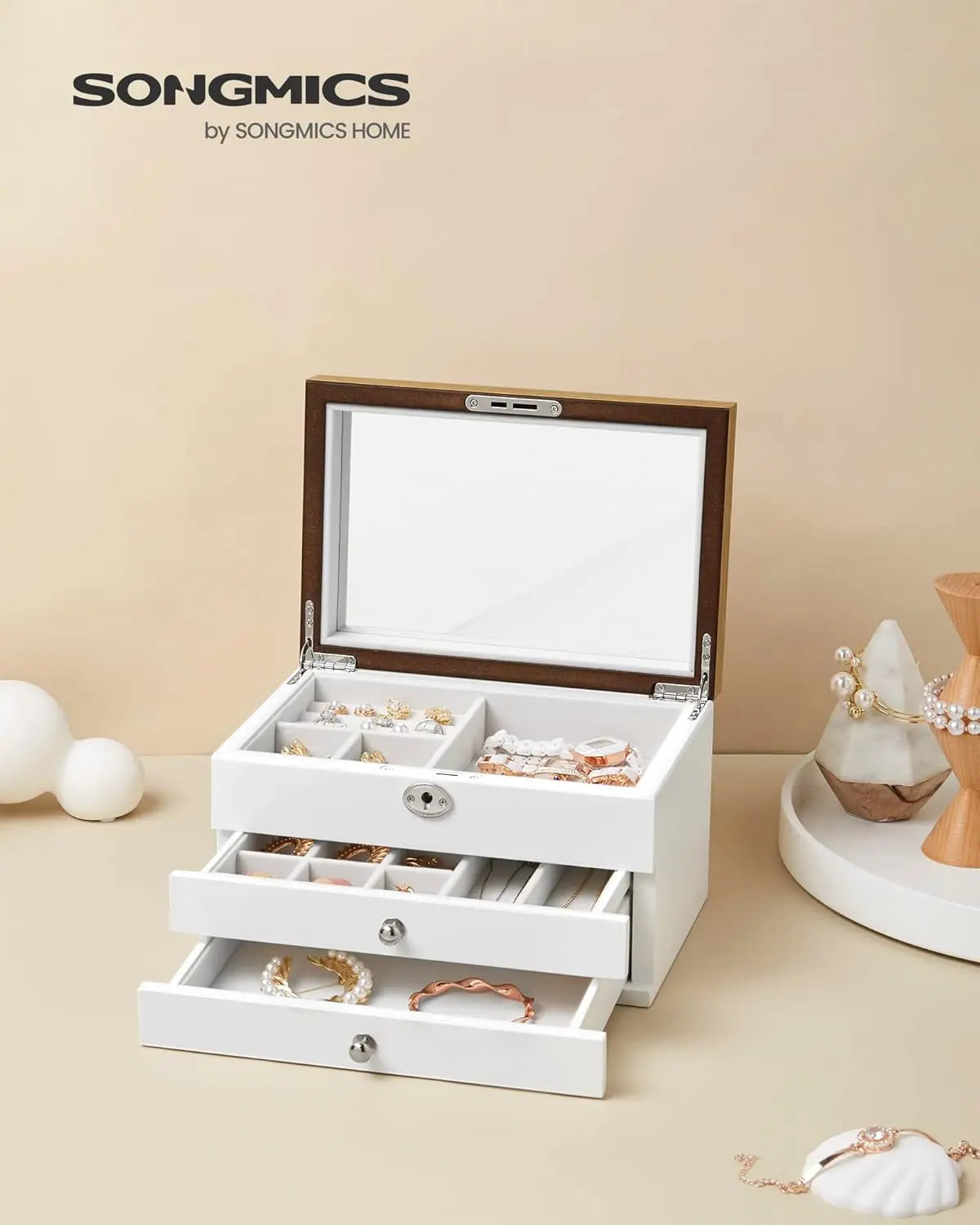 Entdecken Sie das SONGMICS Schmuckkästchen JOW15WN – die perfekte Kombination aus Eleganz und Funktionalität. Mit seinem klaren, modernen Design in elegantem Weiss und stilvoller Holzmaserung wird dieses Schmuckkästchen zum Blickfang auf jedem Schminktisch.