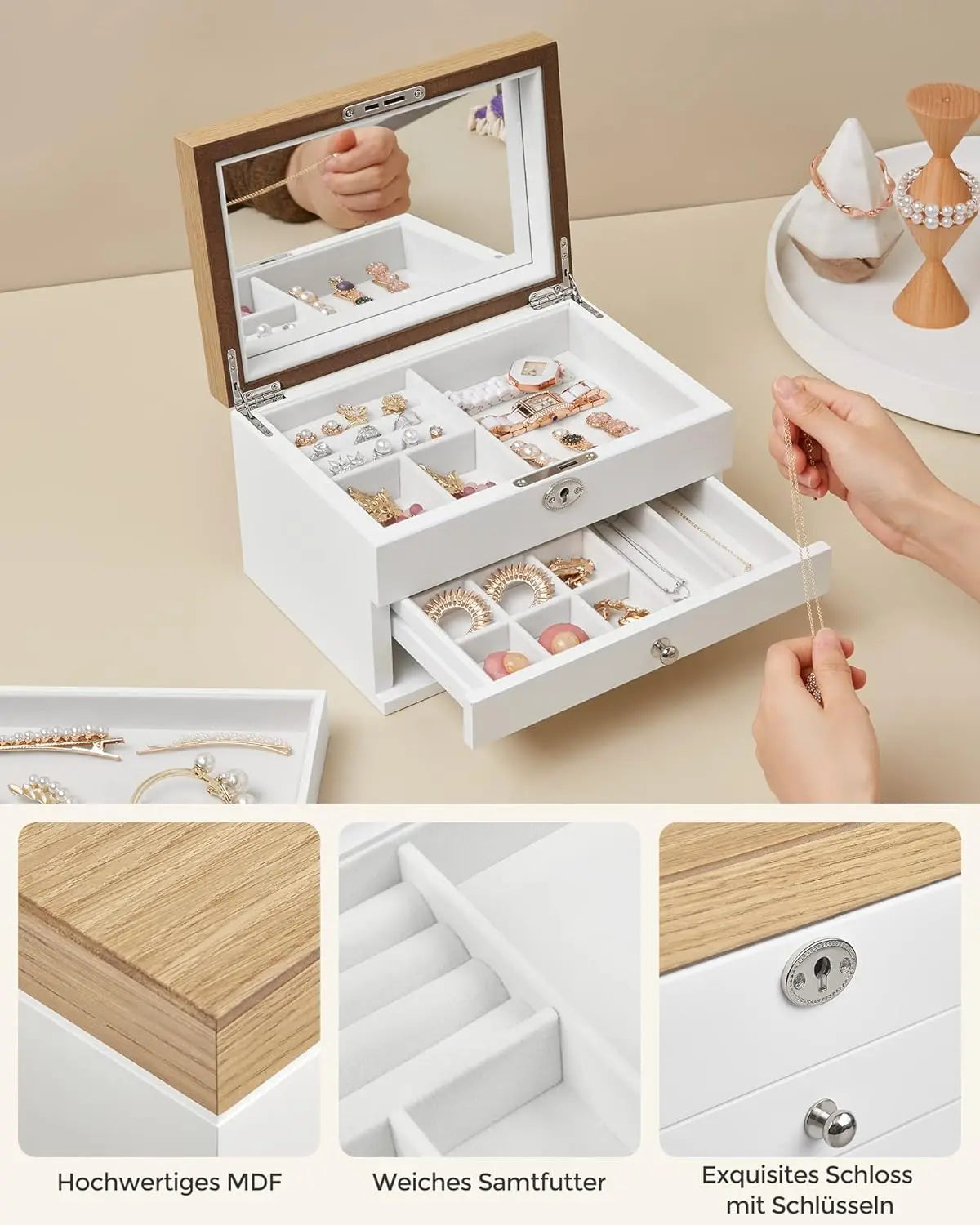 Übersichtliche 3-Ebenen-Aufteilung für Ringe, Ohrringe, Armbänder und Ketten, großer Spiegel im Deckel für schnelles Anprobieren, abschließbar mit weichem Samtfutter für sicheren Schutz
