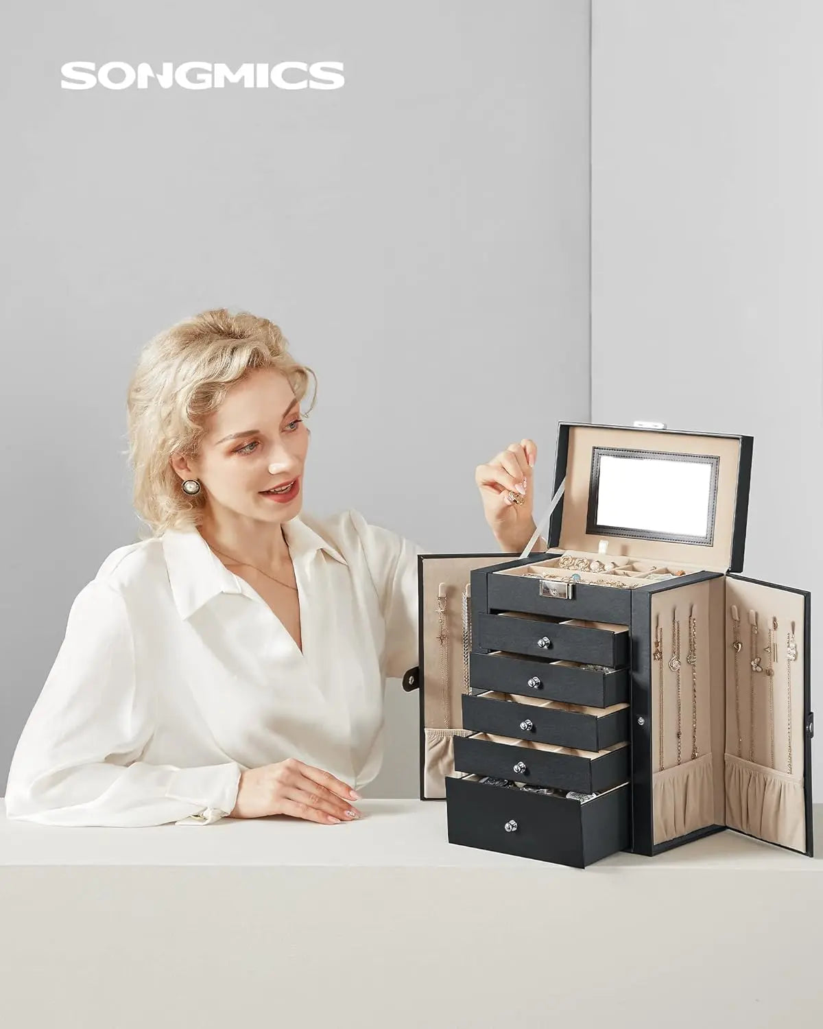 6 Ebenen und 2 seitliche Klapptüren für übersichtliche Aufbewahrung, Weiches Samtfutter und robuster PU-Bezug schützen Schmuck sicher, Premium-Verschluss und stabile MDF-Struktur für sicheren Halt