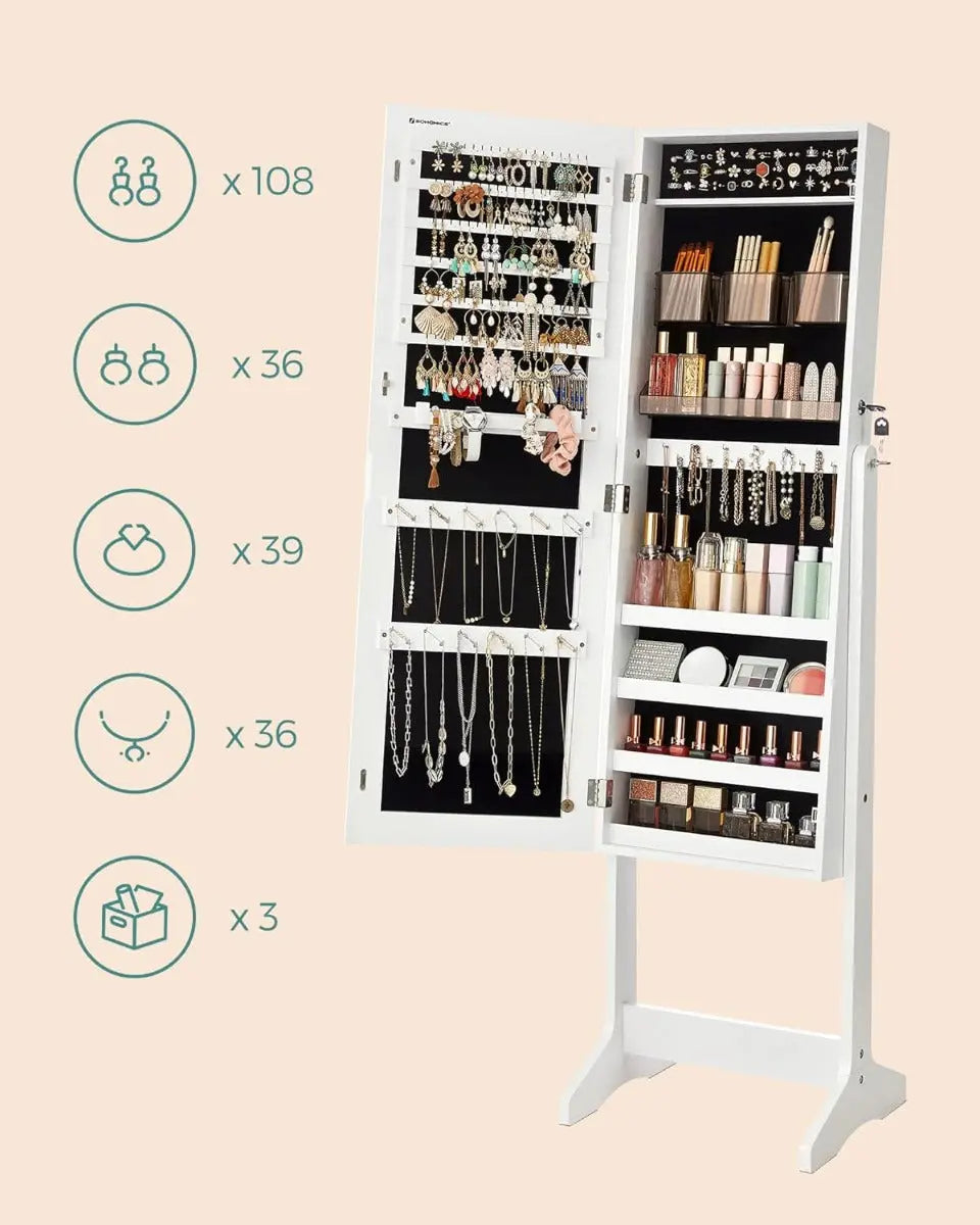 Platzsparende Schmuckaufbewahrung mit 108 Halterungen, 36 Ohrring-Löchern und 39 Ringfächern, Integrierter Ganzkörperspiegel mit abschliessbarem Innenraum und Anti-Kipp-Sicherung, Organizer und Ablagen für Make-up und Pinsel, vormontierter Korpus für schnelle Inbetriebnahme