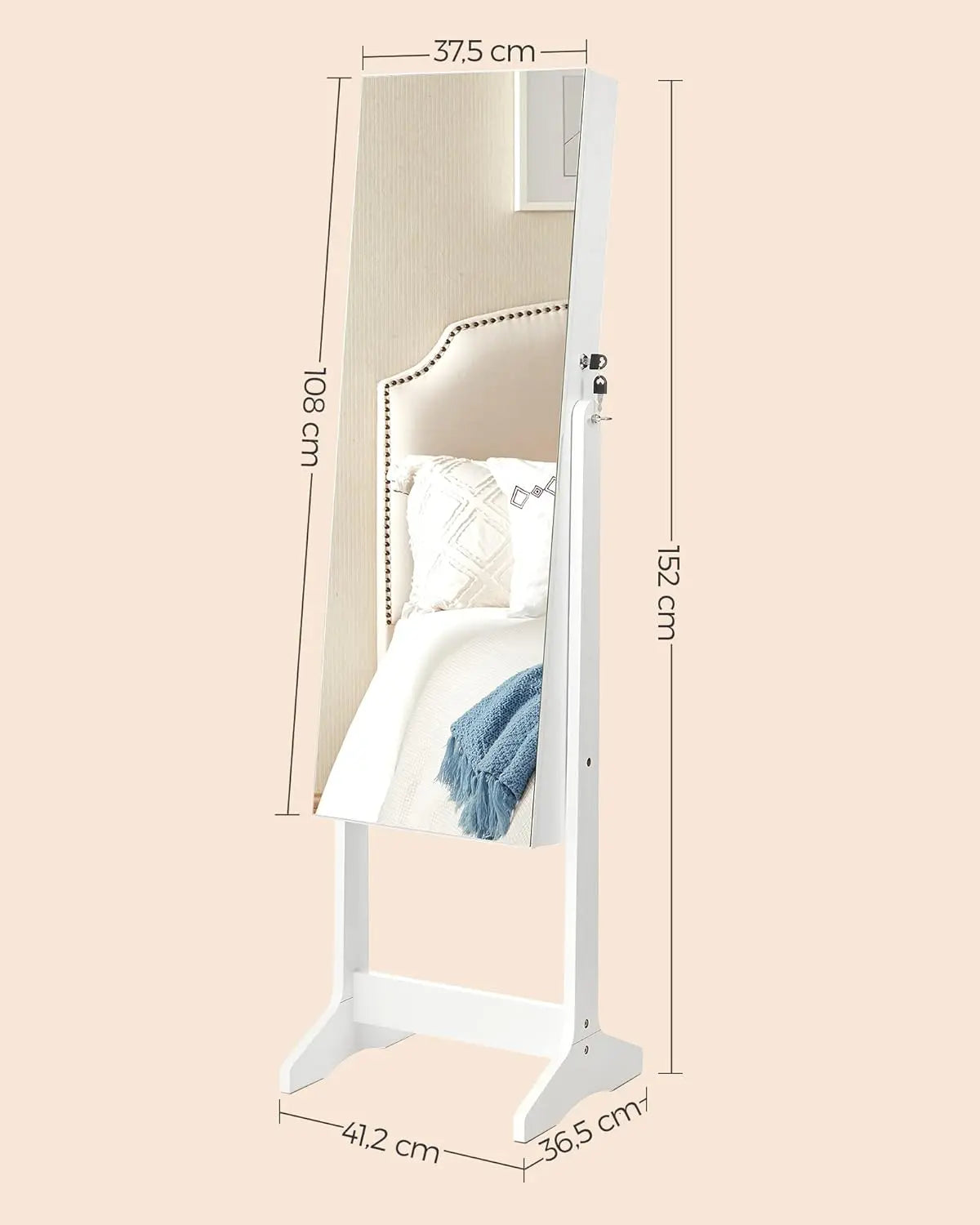 Der SONGMICS Schmuckschrank JJC002W01 verbindet elegantes Design mit durchdachter Funktionalität und bietet eine platzsparende, aber grosszügig organisierte Lösung für Ihre Schmuck- und Kosmetikaufbewahrung: Aus robustem, pflegeleichtem MDF in stilvollem Weiss gefertigt misst der freistehende Spiegelschrank insgesamt 41,2 x 36,5 x 152 cm (L x W x H), das Innenfach 37,5 x 9,7 x 108 cm, bei einem Gesamtgewicht von nur 11,4 kg – ideal für Schlafzimmer oder Ankleidezimmer. Hinter dem rahmenlosen Ganzkörperspiegel verbirgt sich ein durchdachtes Innenleben mit Platz für insgesamt 108 Halterungen und 36 Löchern für Ohrringe, 36 Haken für Ketten, 39 Steckplätzen für Ringe sowie einer praktischen Stange für Armbänder.