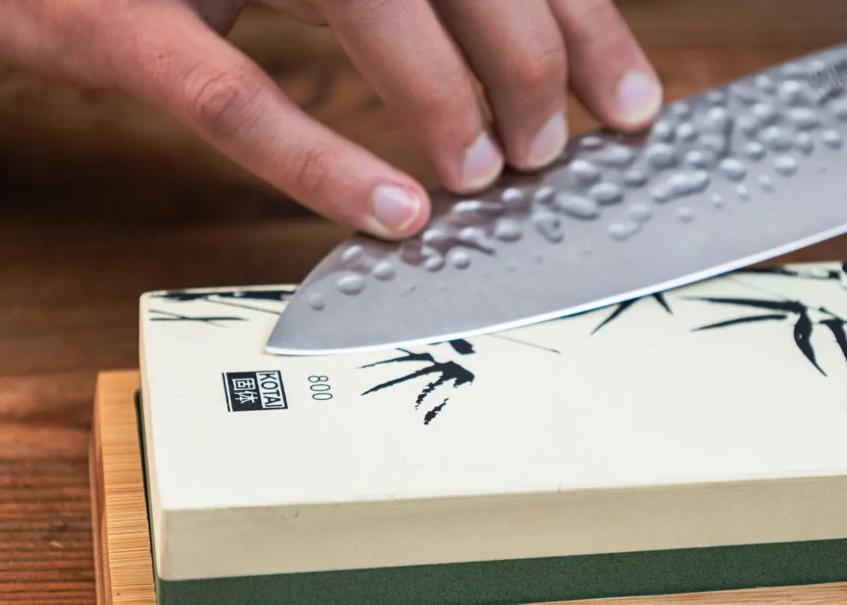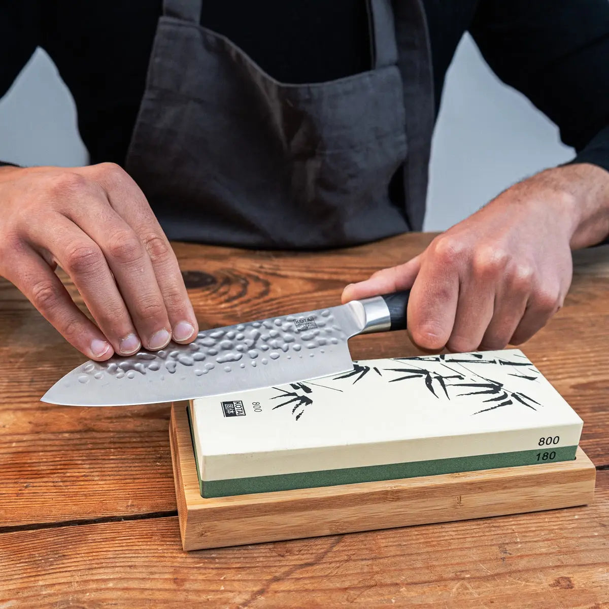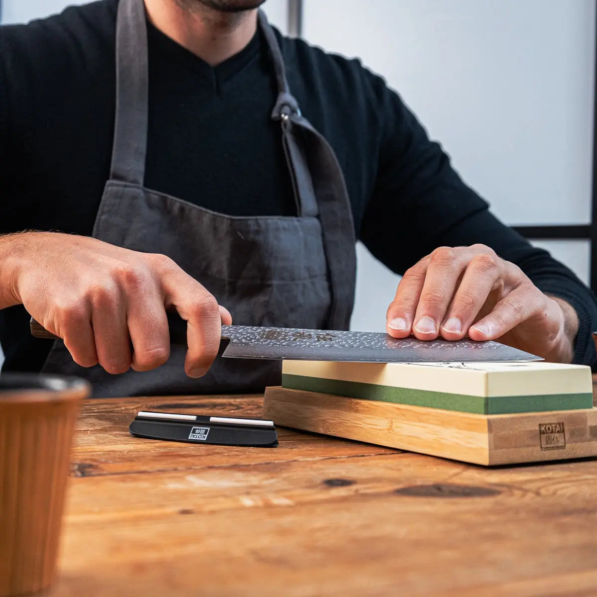 Der KOTAI 180/800 Kombi-Schleifstein ist zur Stabilität auf einem Gummifuss montiert. Das macht ihn nicht nur sicherer für Finger, sondern ermöglicht es auch, den Schärfwinkel konstant zu halten.