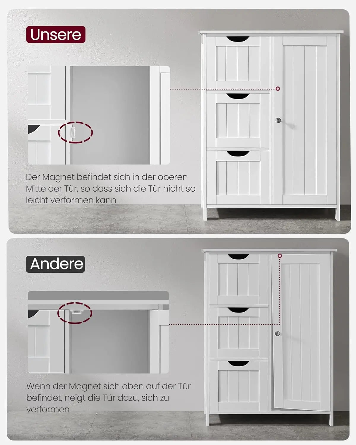 Hergestellt aus robusten MDF / Spanplatte-Platten, bietet dieser Badezimmerschrank nicht nur Stabilität, sondern auch Sicherheit. Der mitgelieferte Kippschutz sorgt dafür, dass der Schrank fest an seinem Platz bleibt – ideal für Haushalte mit Kindern oder Haustieren.