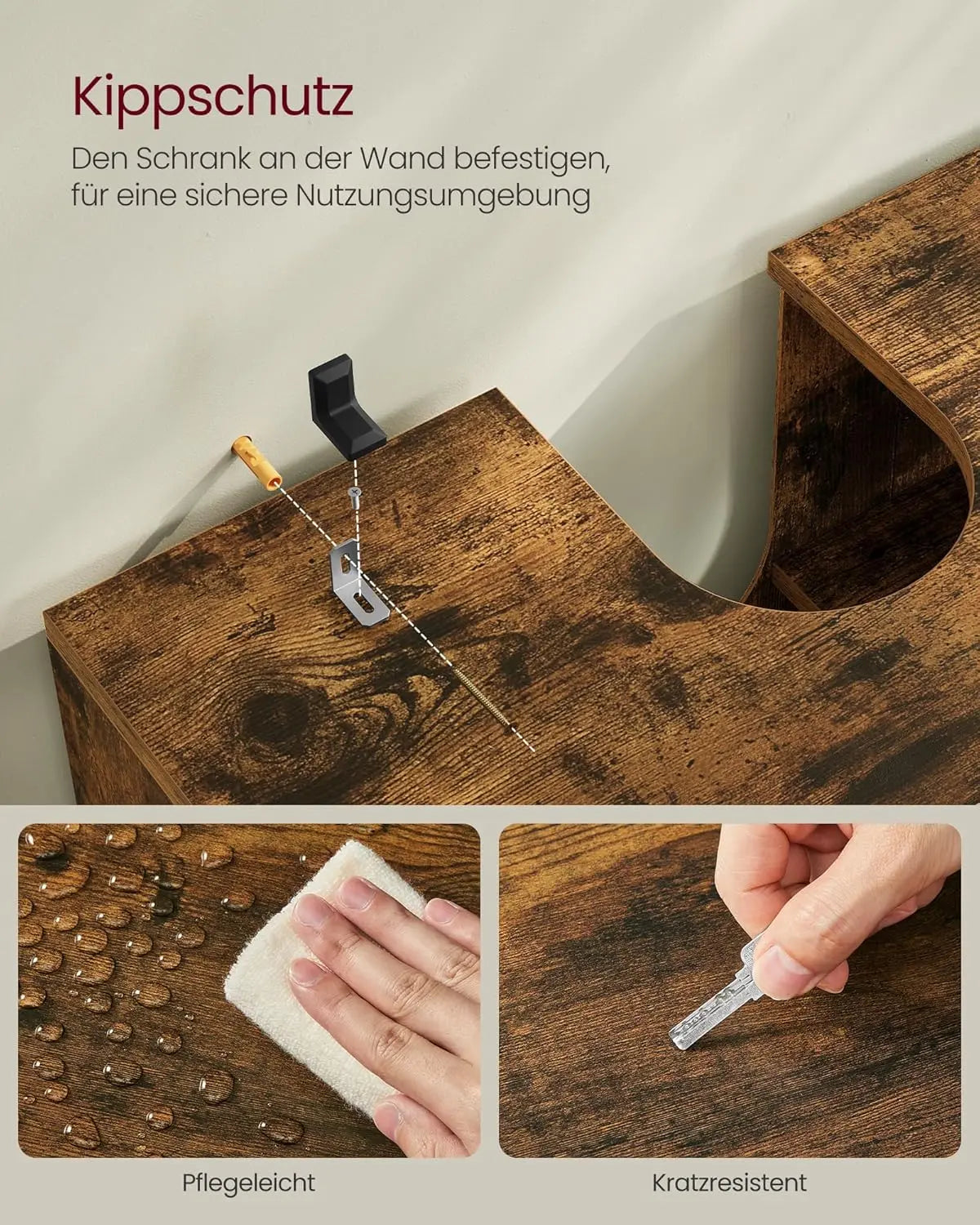 Das vintagebraune Finish verleiht Ihrem Bad einen zeitlosen Charme und sorgt für einen einzigartigen Charakter, der sofort ins Auge fällt. Hergestellt aus hochwertigem Holzwerkstoff der Klasse E1, ist dieser Unterschrank nicht nur stabil und robust, sondern auch langlebig – je länger Sie ihn nutzen, desto besser wird er!