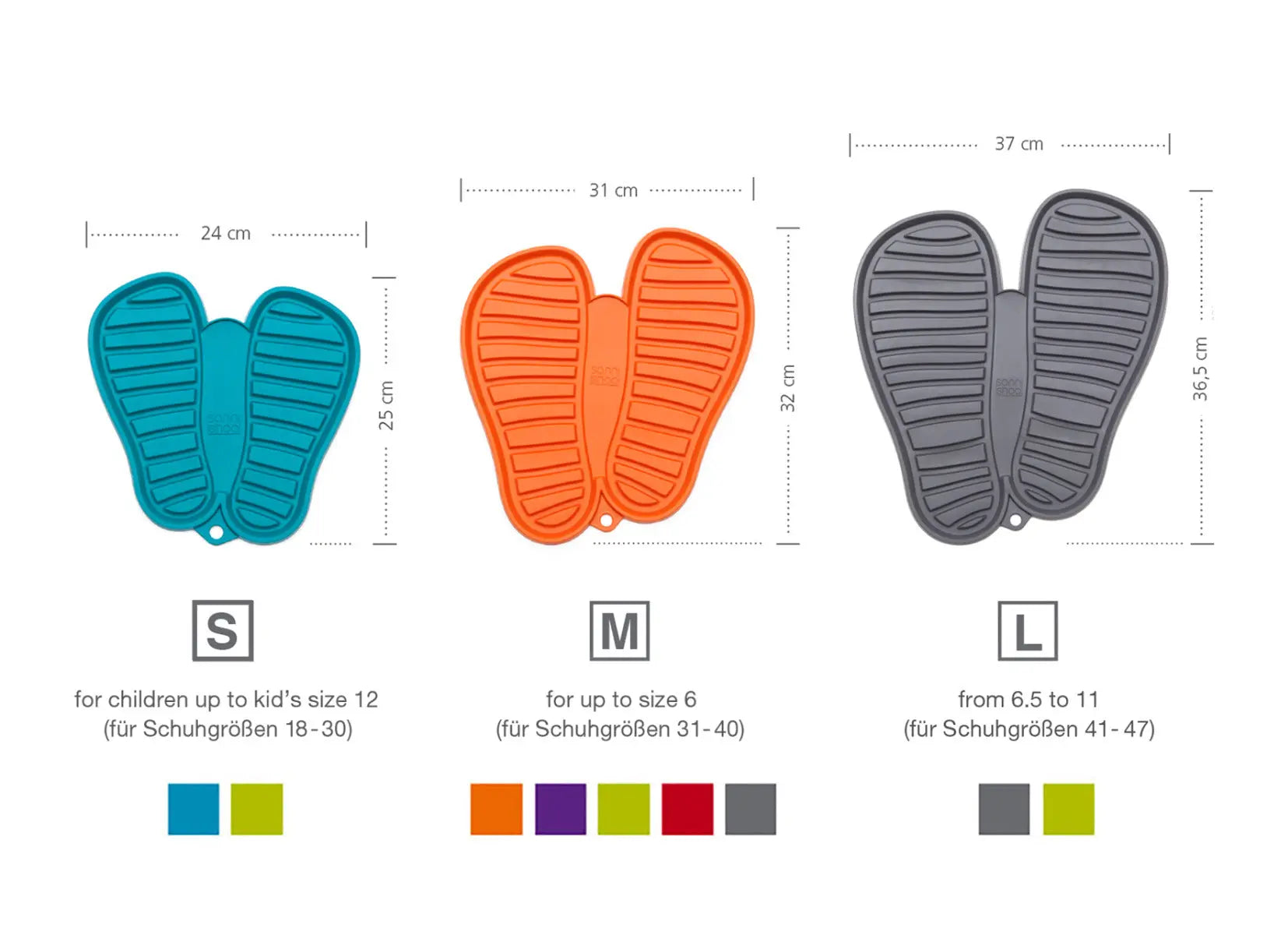 Shoo.pads gibt es für die ganze Familie in 3 Grössen – S, M & L (S passt für Kleinkinder bis Grösse 31, M für alle Schuhe bis Grösse 41 und L wurde für Schuhe bis Grösse 47 entwickelt).