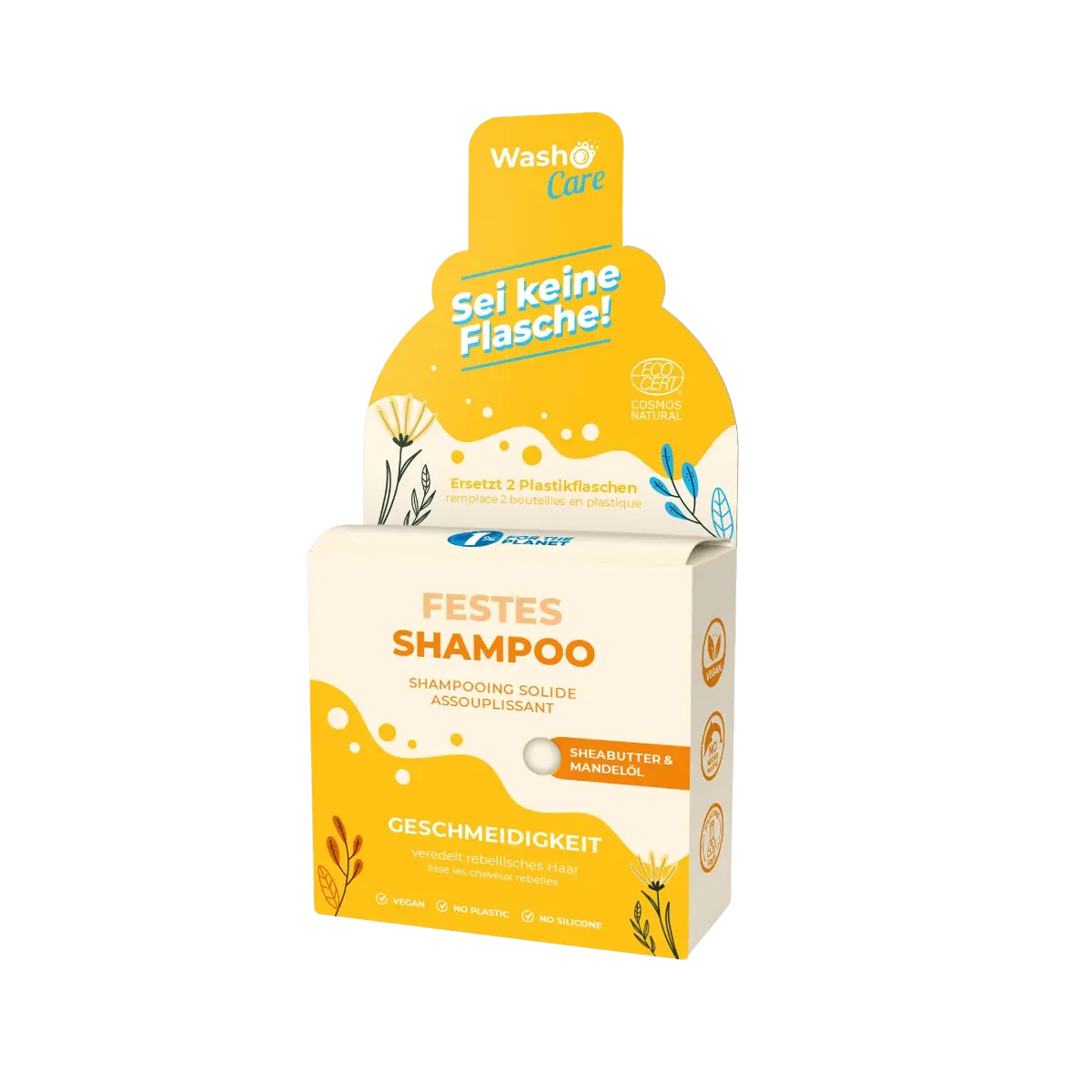 Das feste Geschmeidigkeits Shampoo von Washo Care bietet ein Plastikfreies Duscherlebnis.