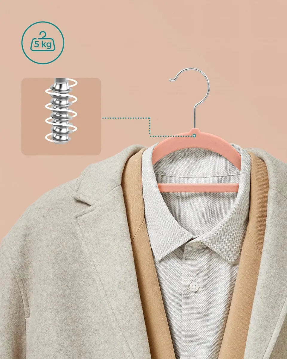 Die SONGMICS Samt-Kleiderbügel im praktischen Set vereinen elegantes Design mit cleverer Funktionalität. Ihre samtige Oberfläche sorgt für rutschfesten Halt – selbst bei feinen Stoffen – und schützt gleichzeitig die Form deiner Kleidung. Dank der geschwungenen Schulterpartien entstehen keine Druckstellen, während die U-förmige Aussparung das Aufhängen von Kleidungsstücken mit engem Kragen erleichtert.
