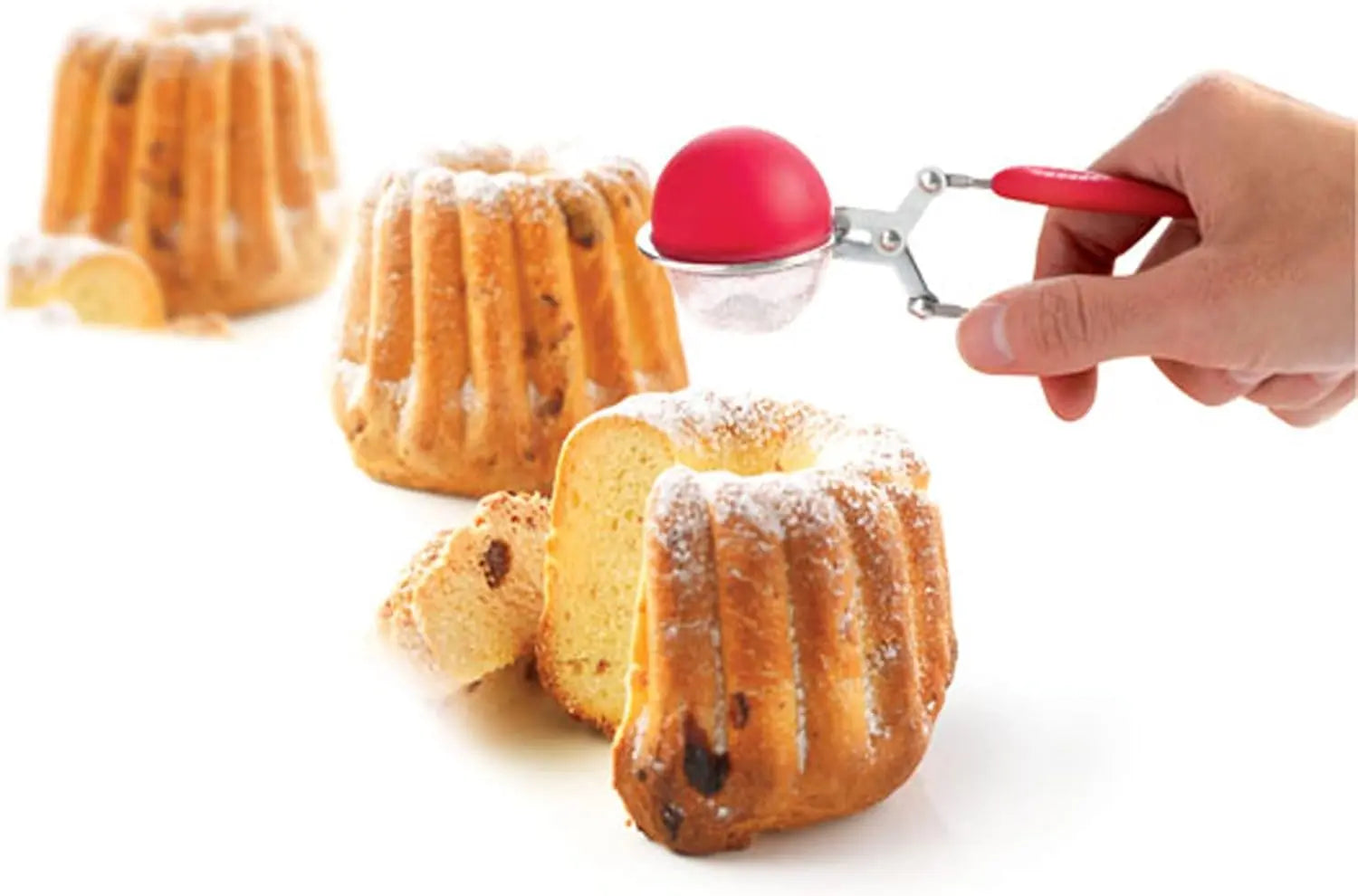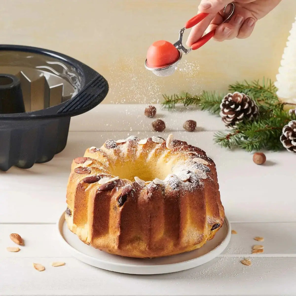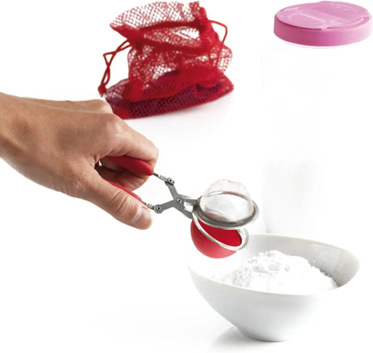 Mit der Teezange und Bestäuber 2-in-1 rot hast du gleich zwei Küchenhelfer in einem. Befülle die flexible Silikonhülle mit Kakao, Puderzucker oder feinen Gewürzen, und schon verwandelst du Kuchen, Desserts oder Getränke in kleine Kunstwerke – gleichmässig bestäubt wie vom Profi.