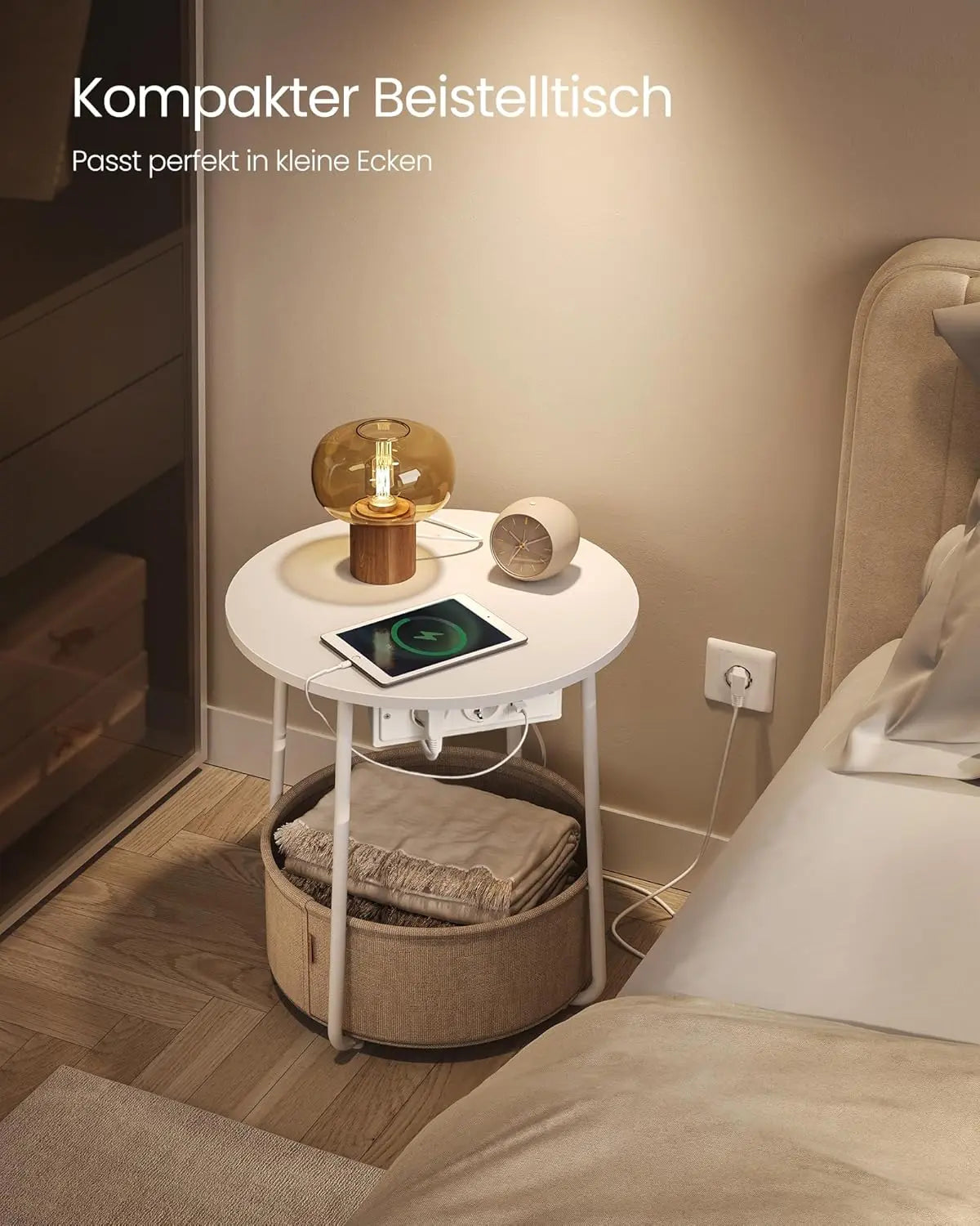 Beistelltisch mit Steckdose Stauraum, Mattweiss-Kamelbraun