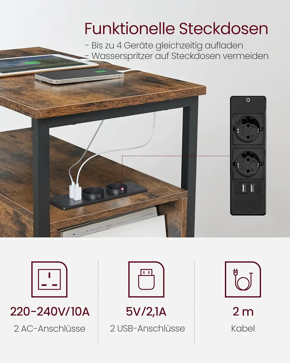 Beistelltisch mit Steckdosenleiste Vintagebraun-Schwarz