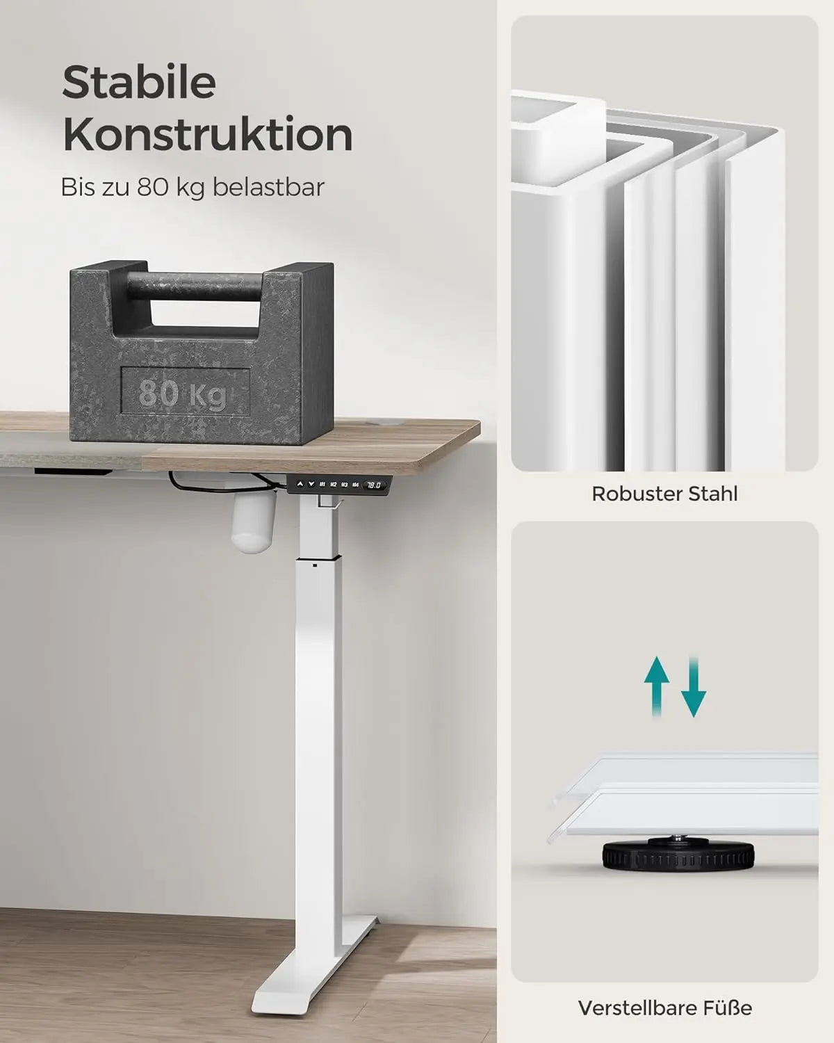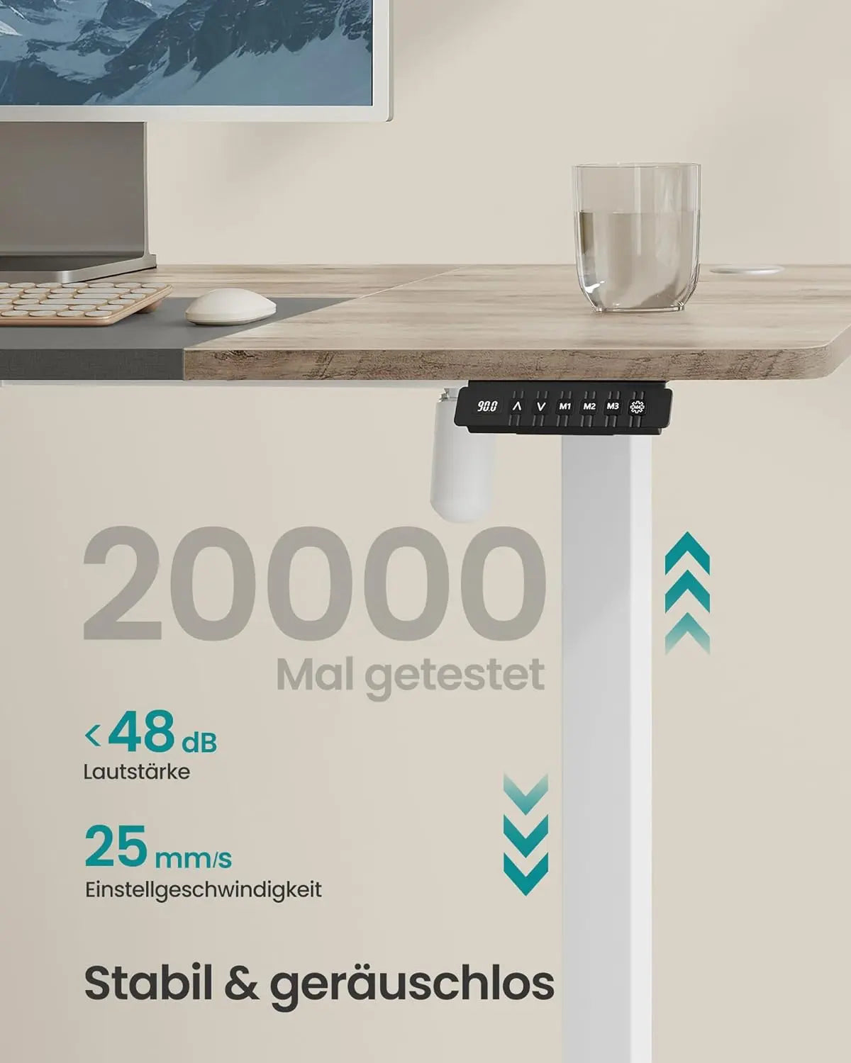 Die hochwertige Verarbeitung des Schreibtisches überzeugt durch einen robusten Stahlrahmen und eine dicke Tischplatte, die eine Belastbarkeit von bis zu 70 kg gewährleistet. Der leistungsstarke Motor sorgt für eine gleichmässige und geräuschlose Verstellung – mit einem Geräuschpegel von unter 48 dB bleibt Ihr Arbeitsumfeld angenehm ruhig.