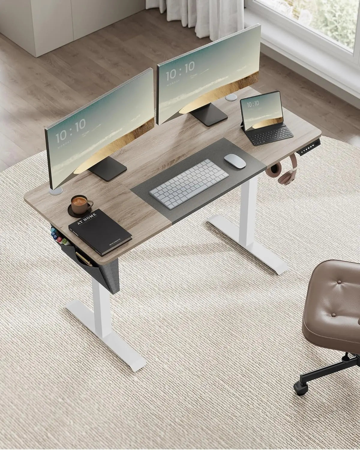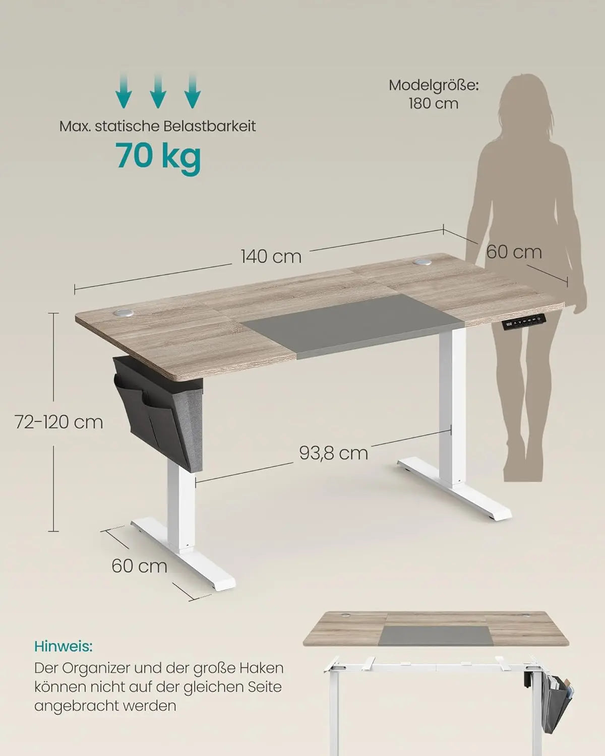 Stufenlose Höhenverstellung 72–120 cm mit Memory-Funktion für 4 gespeicherte Positionen, Robuster Stahlrahmen und 70 kg Tragfähigkeit mit leisem Motor unter 48 dB, Praktisches Kabelmanagement mit Haken und Stoff-Organizer für aufgeräumten Arbeitsplatz