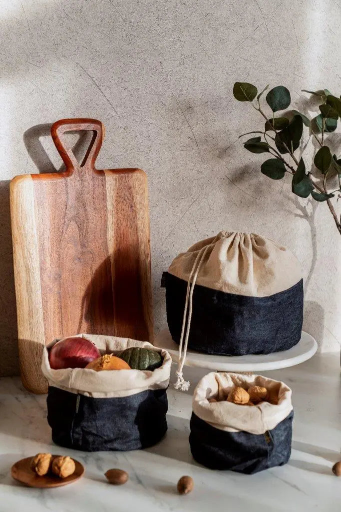 Praktischer Brotbeutel verwandelt sich durch Umschlagen in einen Brotkorb, Aus hochwertigem Jeans-Stoff und Baumwolle, Waschmaschinengeeignet für einfache Reinigung
