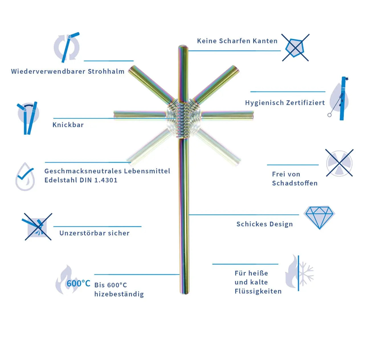 Für die Trinkhalme wird nur Edelstahl, das mit dem Materialgütesiegel DIN 1.4301 ausgezeichnet ist, verwendet.