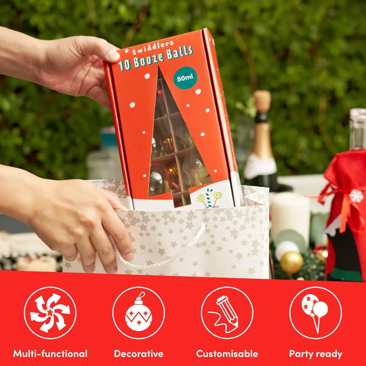 Diese 50 ml-Kunststoffkugeln zum Befüllen mit Spirituosen sorgen für festliche Stimmung mit Augenzwinkern. Ob als Geschenk, Party-Gag oder stilvolle Baumdeko – ein Highlight für Erwachsene zu Weihnachten!