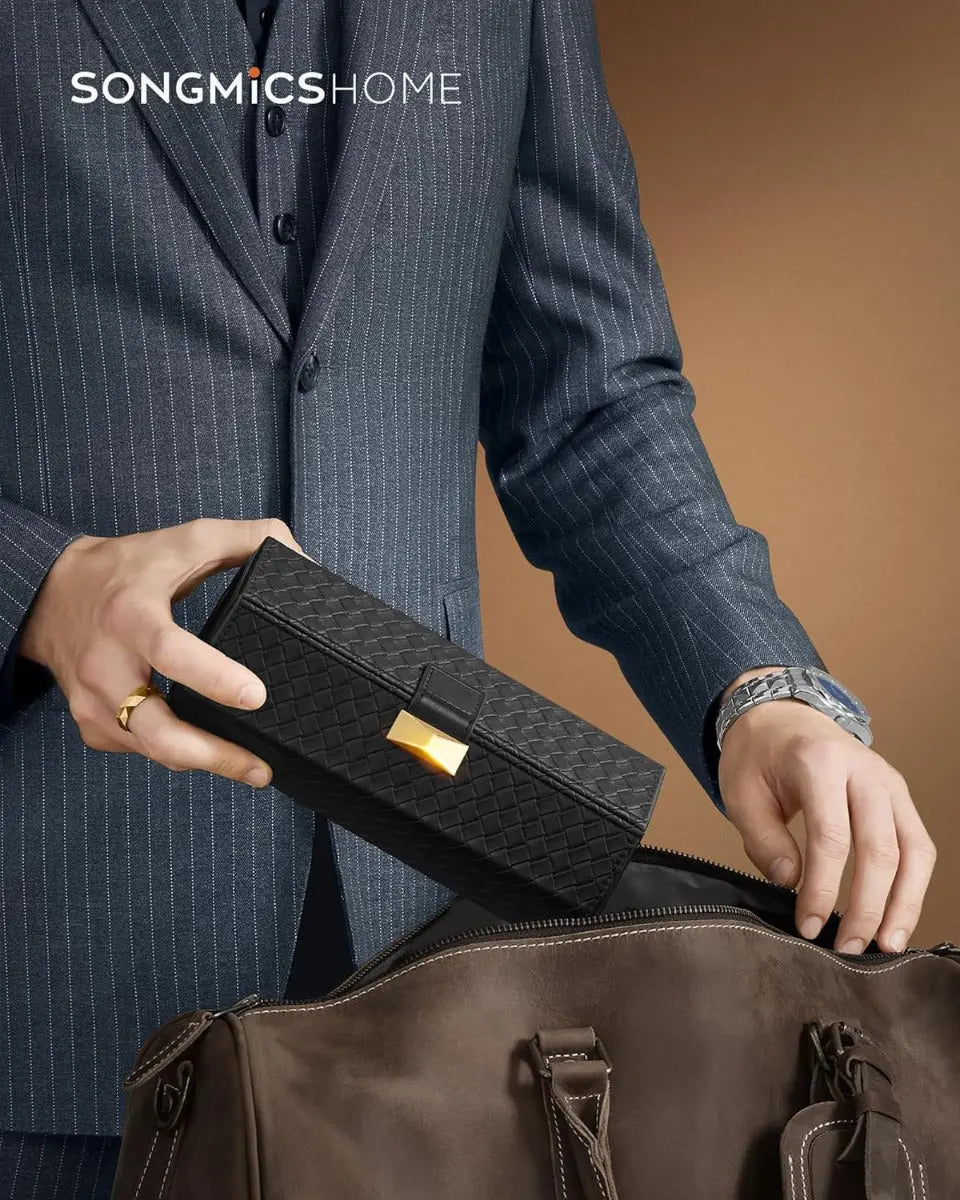 Die Uhrenrolle aus der RONNE Kollektion von SONGMICS verbindet zeitlose Eleganz mit praktischer Funktion. Das auffällige sechseckige Design und die Flechtoptik aus PU-Kunstleder machen sie zu einem stilvollen Accessoire – ob auf Reisen oder als dekoratives Element zu Hause.