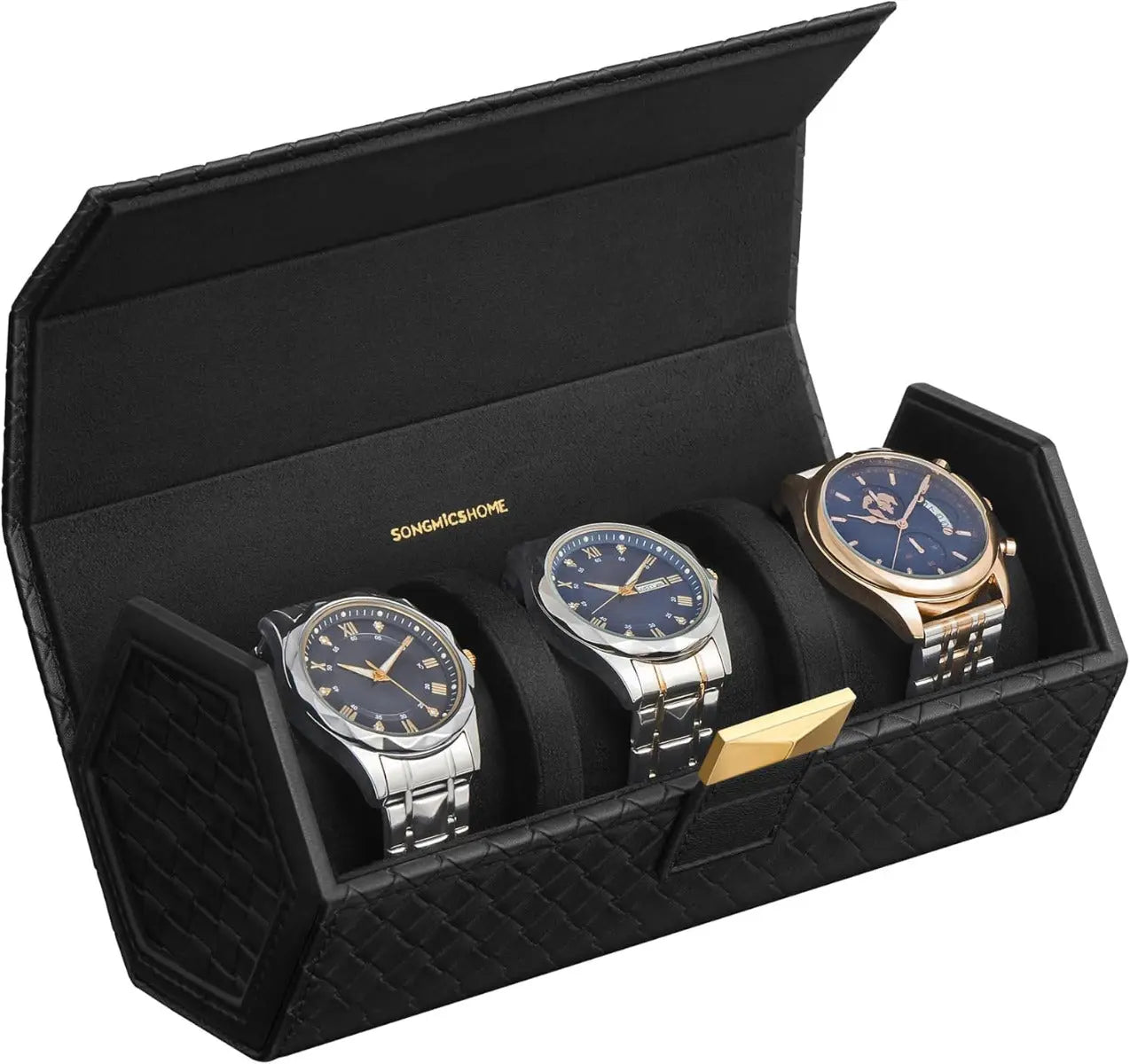 SONGMICS Uhrenaufbewahrungsbox Hexagon für 3 Uhren – RONNE Kollektion, mit verstecktem Stauraum, PU in Flechtoptik, kompakt & reisefreundlich, schwarz