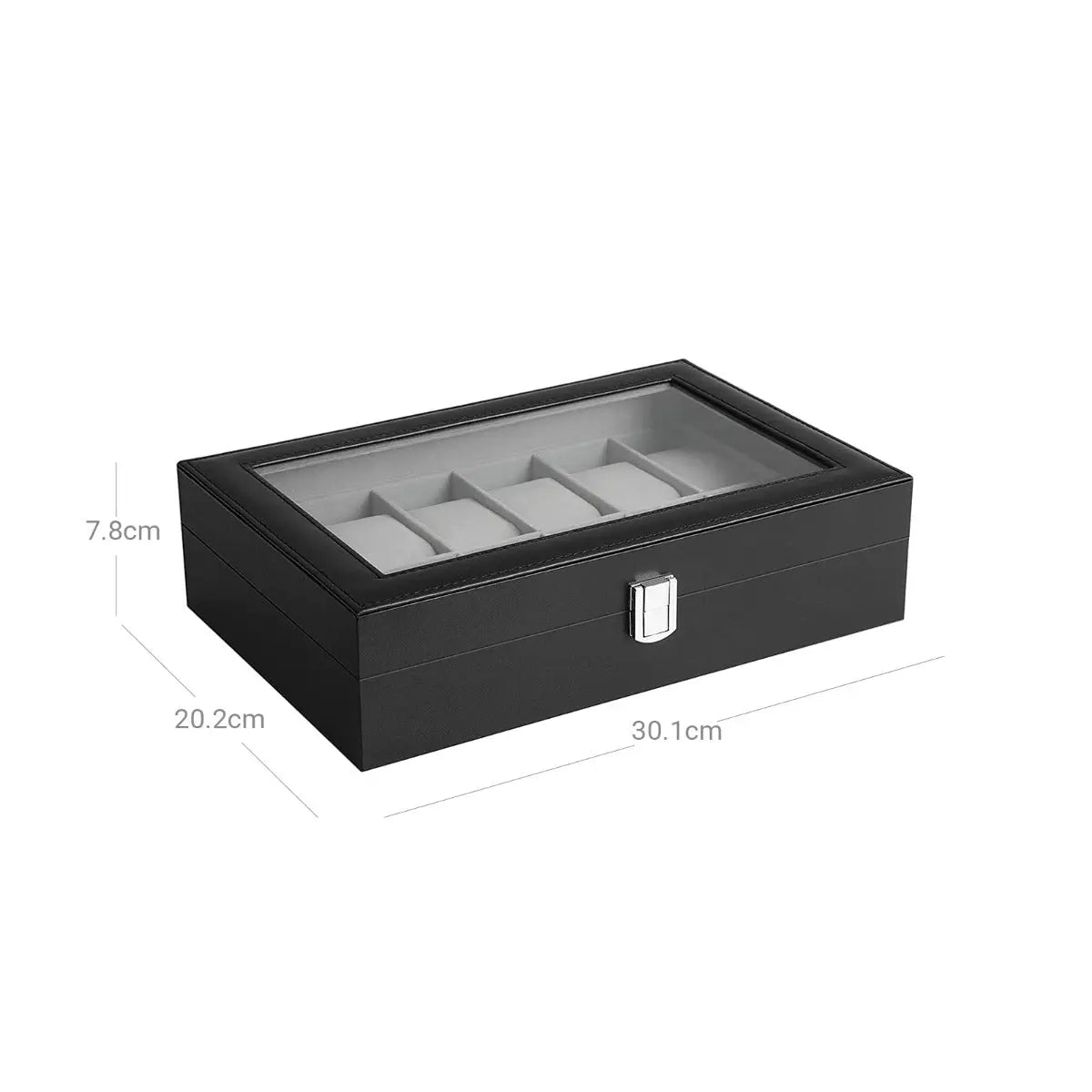 Dank des transparenten Glasdeckels sind alle Uhren auf einen Blick sichtbar – perfekt, um morgens schnell das passende Modell auszuwählen. Die 12 Uhrenkissen sind weich gepolstert, formstabil und herausnehmbar, sodass auch Schmuck oder Accessoires sicher verstaut werden können. Der hochwertige Metallverschluss sorgt für ein sicheres und einfaches Öffnen.
