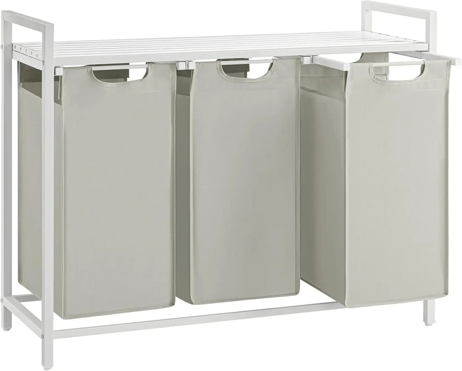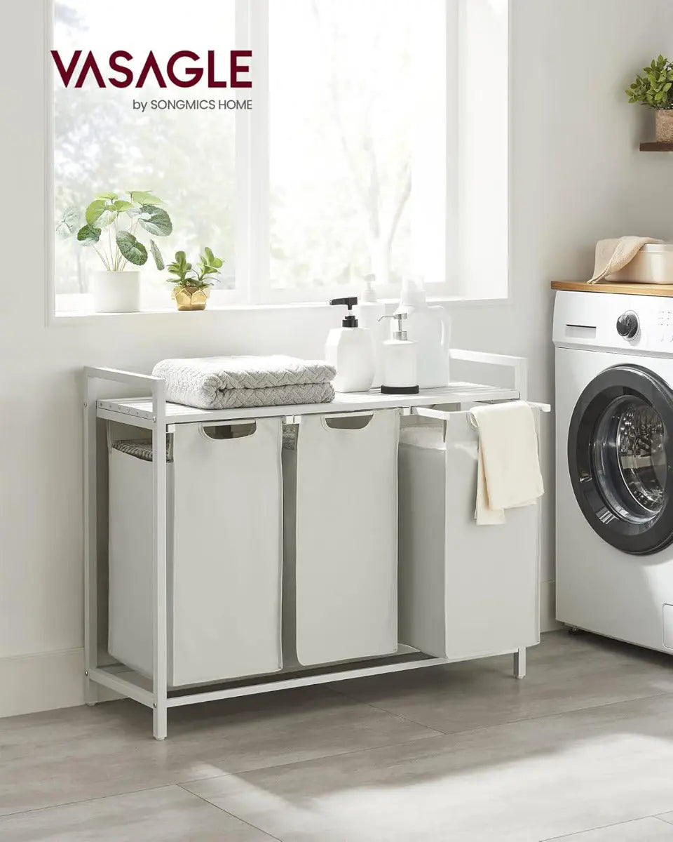 Dreiteiliger Wäschesammler (3×40 L) zur einfachen Trennung, Belüftete Ablage verhindert Gerüche und bietet Platz für Waschmittel, Abnehmbarer Wäschesack mit stabiler Bodenplatte für einfachen Transport