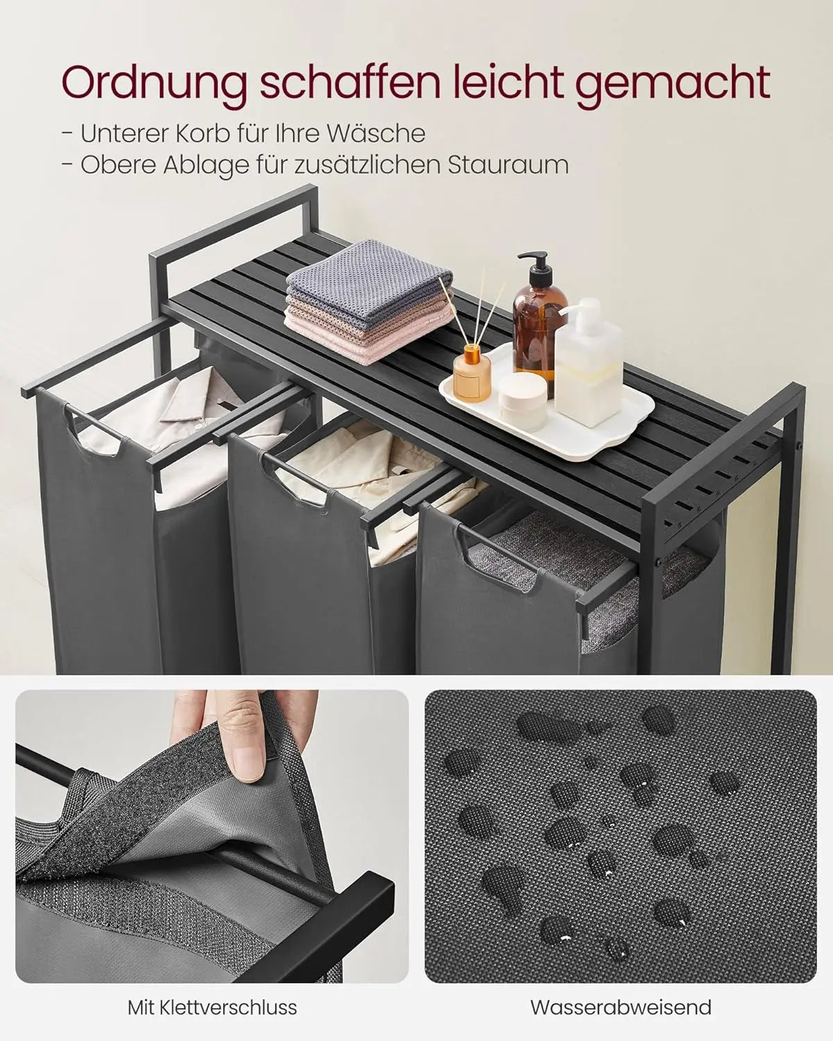 Drei getrennte 40‑L-Fächer für einfache Wäschesortierung, Abnehmbare ausziehbare Wäschesäcke mit stabiler Bodenplatte für einfachen Transport, Ablage mit Lamellen für optimale Luftzirkulation und Waschmittelaufbewahrung