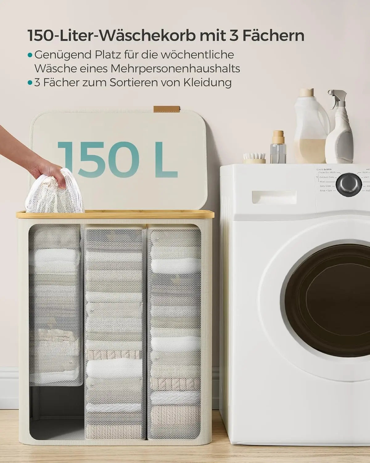 Kunden sind begeistert vom großen 150‑Liter‑Volumen und den drei praktischen Fächern, die Wäsche schnell und übersichtlich sortieren. Besonders beliebt sind der staubschützende Deckel mit elegantem Kunstledergriff, die herausnehmbaren Klett‑Wäschesäcke mit Kordelzug, das waschmaschinentaugliche Netzdesign, das robuste 600D Oxford‑Gewebe sowie die stabile Glasfaser‑Konstruktion und die werkzeuglose, schnelle Montage.