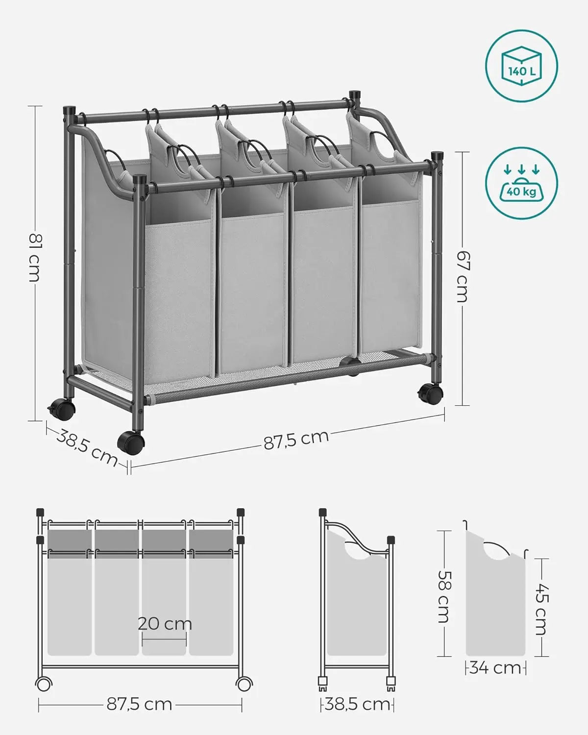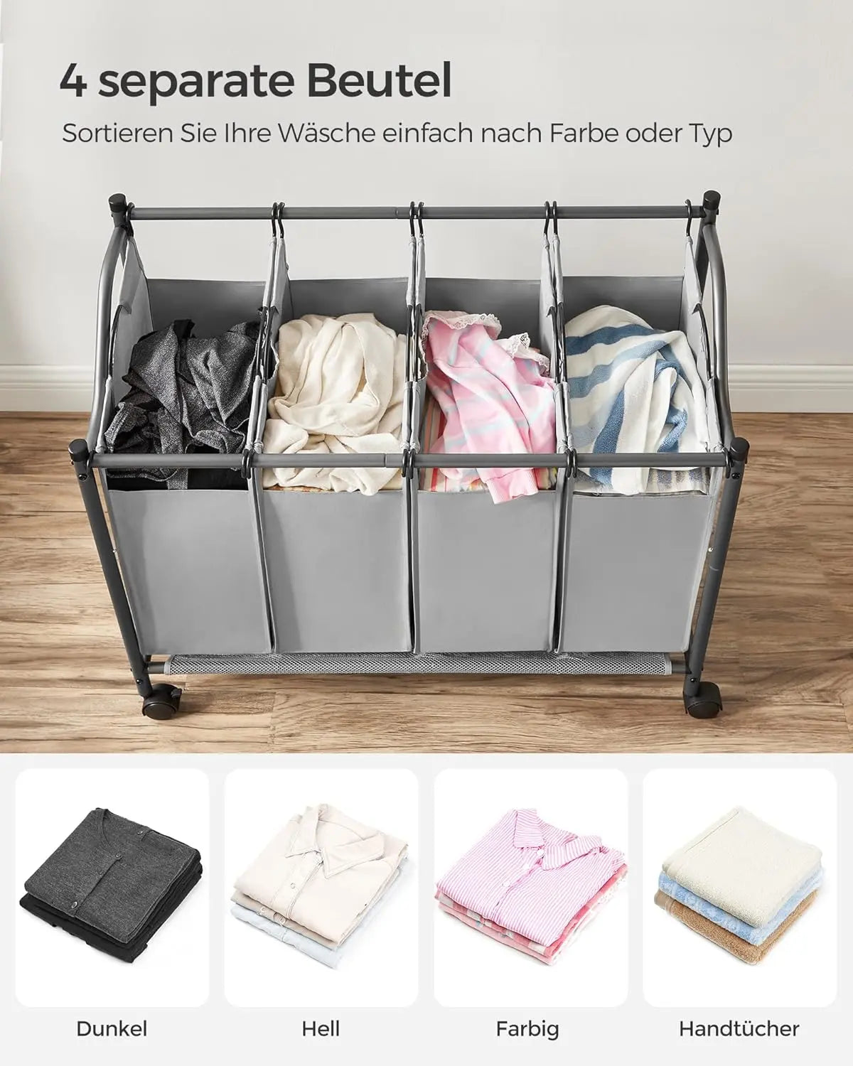 Dank der 4 abnehmbaren Stofftaschen wird das Sortieren Ihrer Wäsche zum Kinderspiel. Ob nach Farben oder Materialien – mit diesem Wäschesortierer haben Sie alles im Griff und sparen wertvolle Zeit an Waschtagen.
