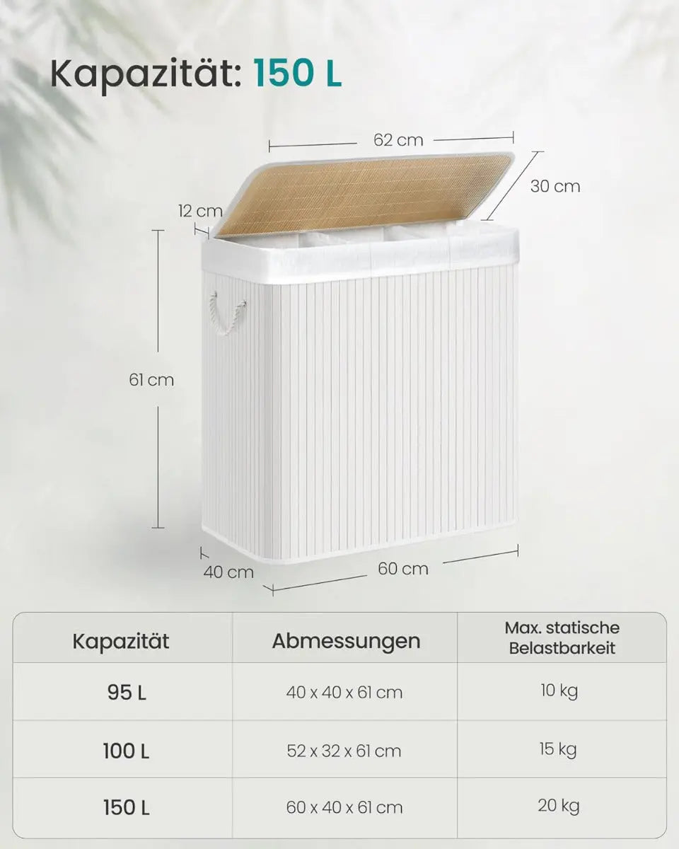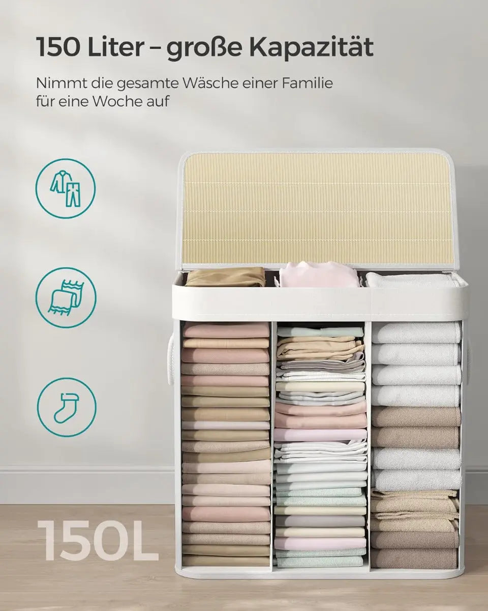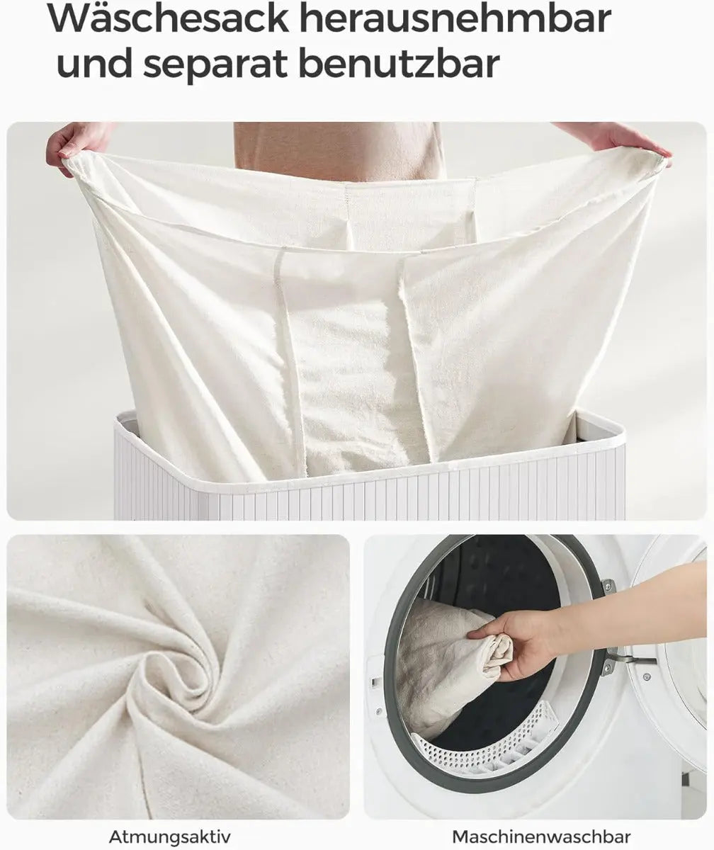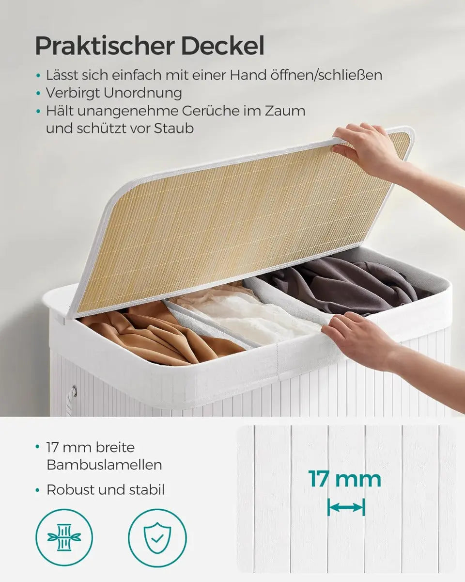 Der SONGMICS Wäschekorb mit 3 Fächern ist die perfekte Lösung für alle, die ihre Schmutzwäsche stilvoll und effizient organisieren möchten. Mit seinem eleganten Bambusrahmen, dem neutralen Weisston und dem natürlichen Look passt er sich harmonisch in jedes Zuhause ein – ob im Schlafzimmer, Badezimmer oder in der Waschküche.