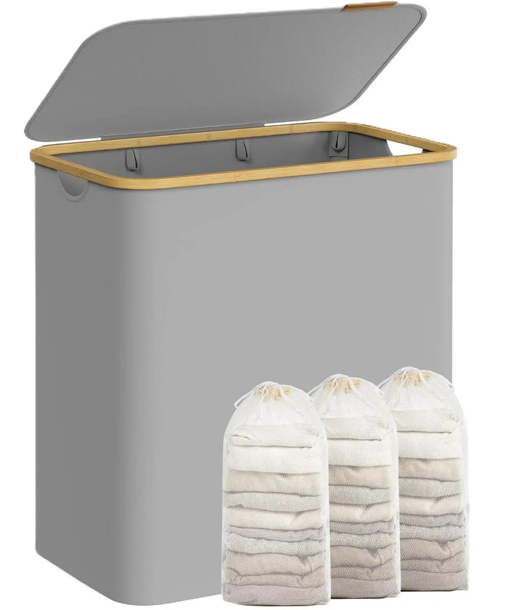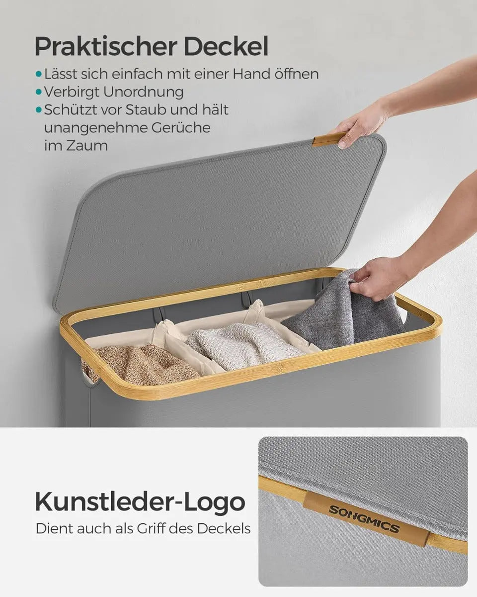 SONGMICS Wäschekorb Wäschesammler mit 3 Fächern – 150 l Fassungsvermögen, Bambus, taubengrau, 60 x 38,5 x 70,5 cm