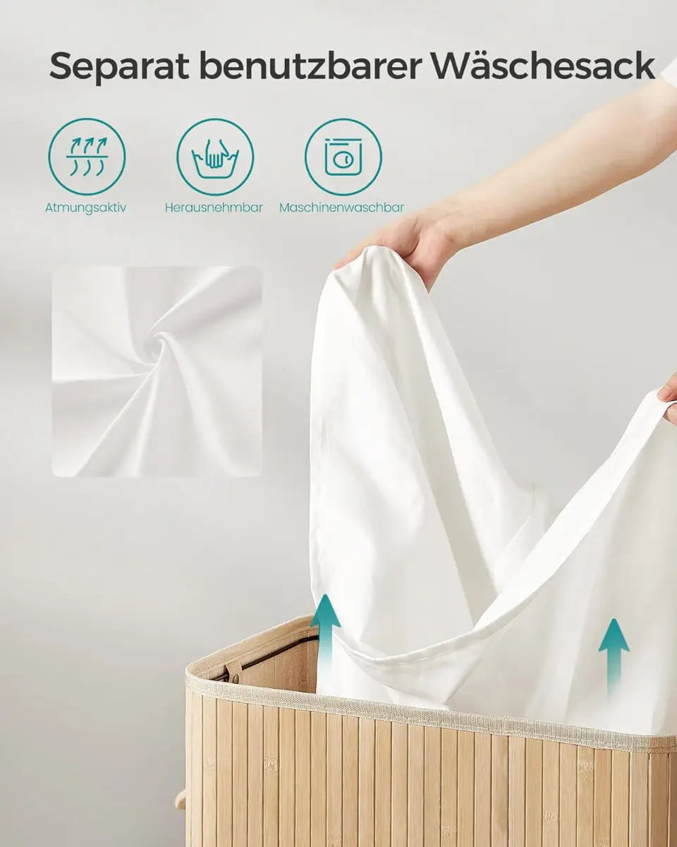 Gefertigt aus 17 mm breiten Bambuslamellen und stabil verstärkt durch einen Metallrahmen, überzeugt der Wäschesammler mit Langlebigkeit und einer Belastbarkeit von bis zu 25 kg. Der herausnehmbare Wäschesack aus hochwertigem Polyester-Baumwoll-Mischgewebe ist maschinenwaschbar und macht den Transport zur Waschmaschine besonders einfach und hygienisch.
