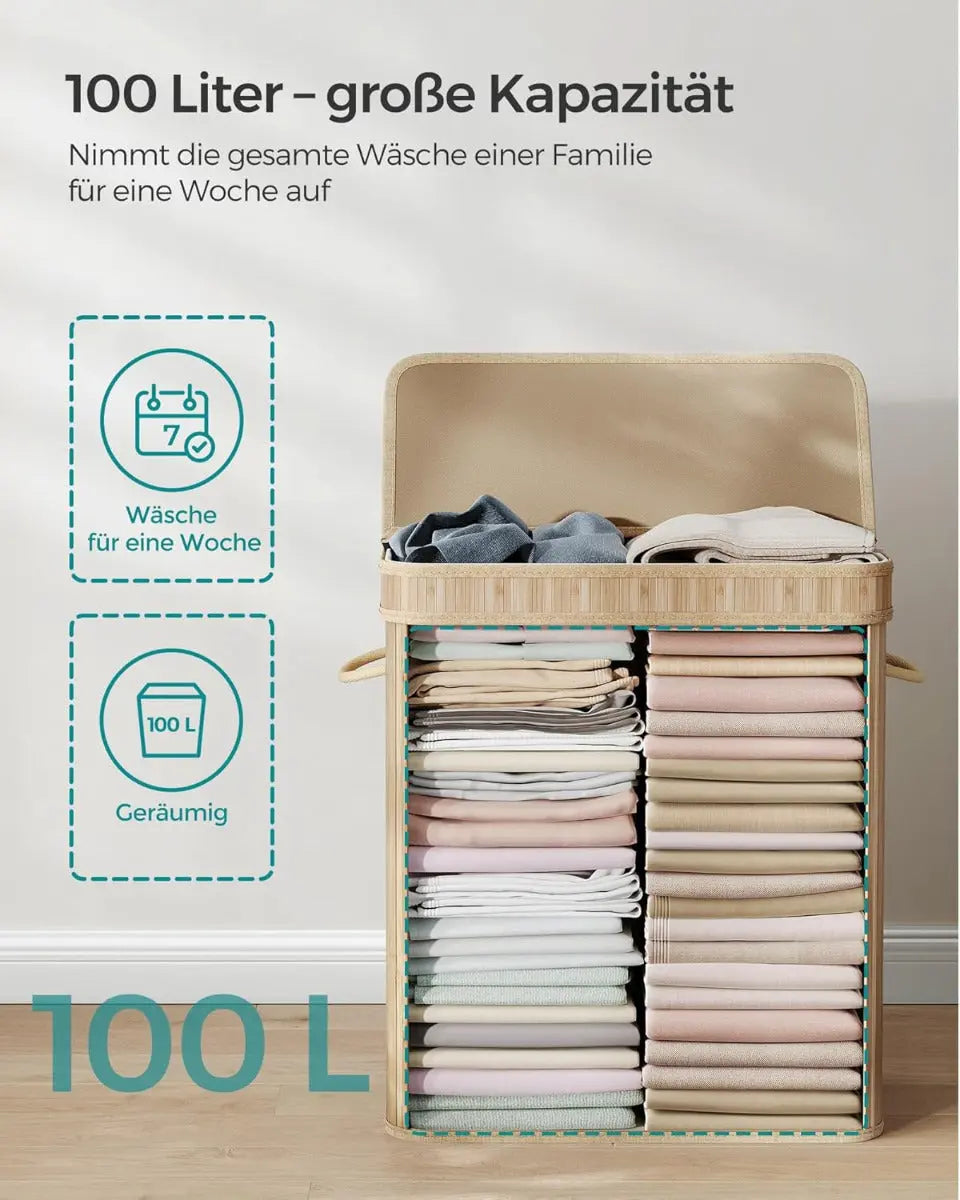 Stylisches Design mit 100 Litern Volumen, Herausnehmbarer Wäschesack für einfachen Transport, Praktischer Deckel schützt vor Staub und hält die Wäsche verborgen.