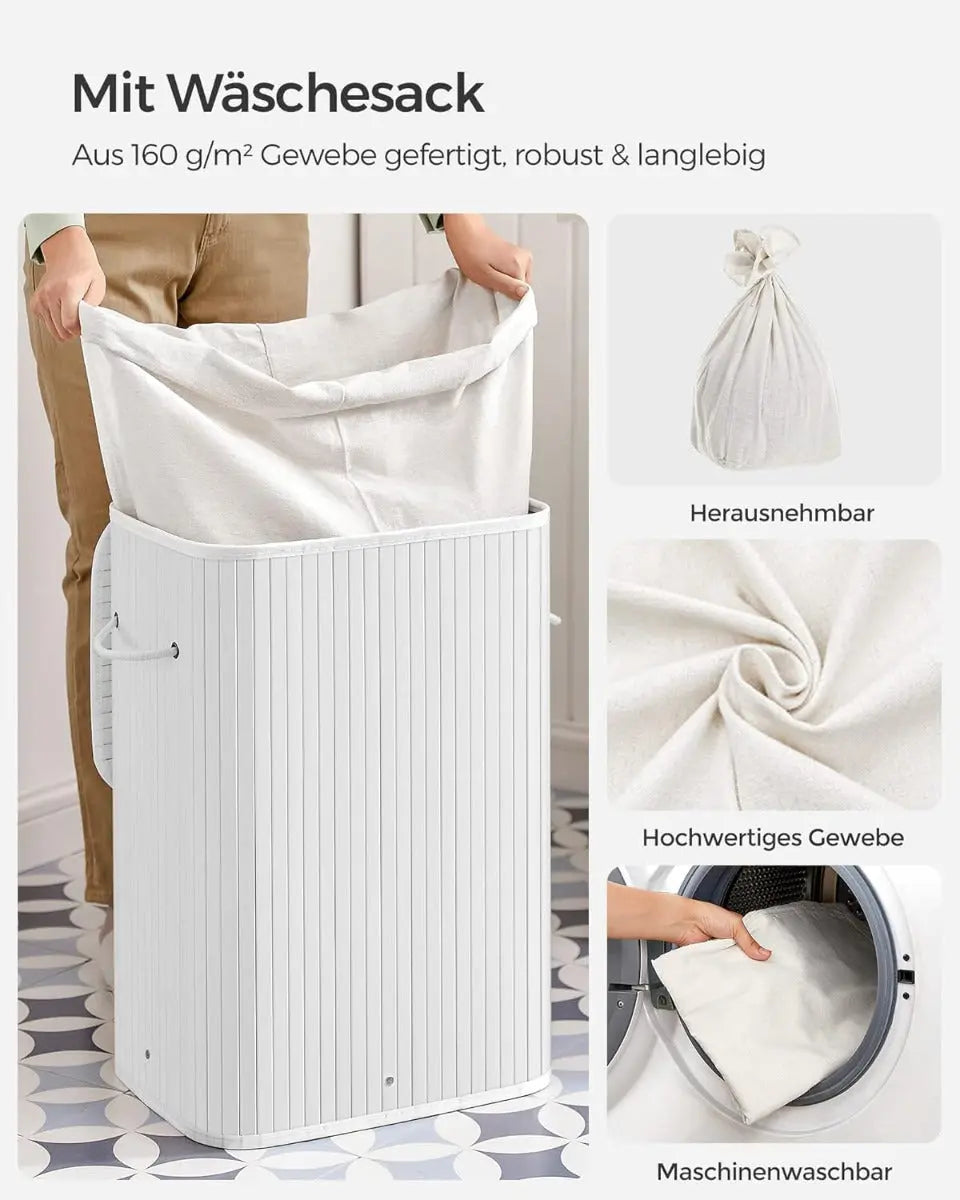 SONGMICS Wäschekorb Wäschesammler mit Deckel – Bambus, herausnehmbarer Innensack, faltbar, 72 l Fassungsvermögen, 40 × 30 × 61 cm, weiss