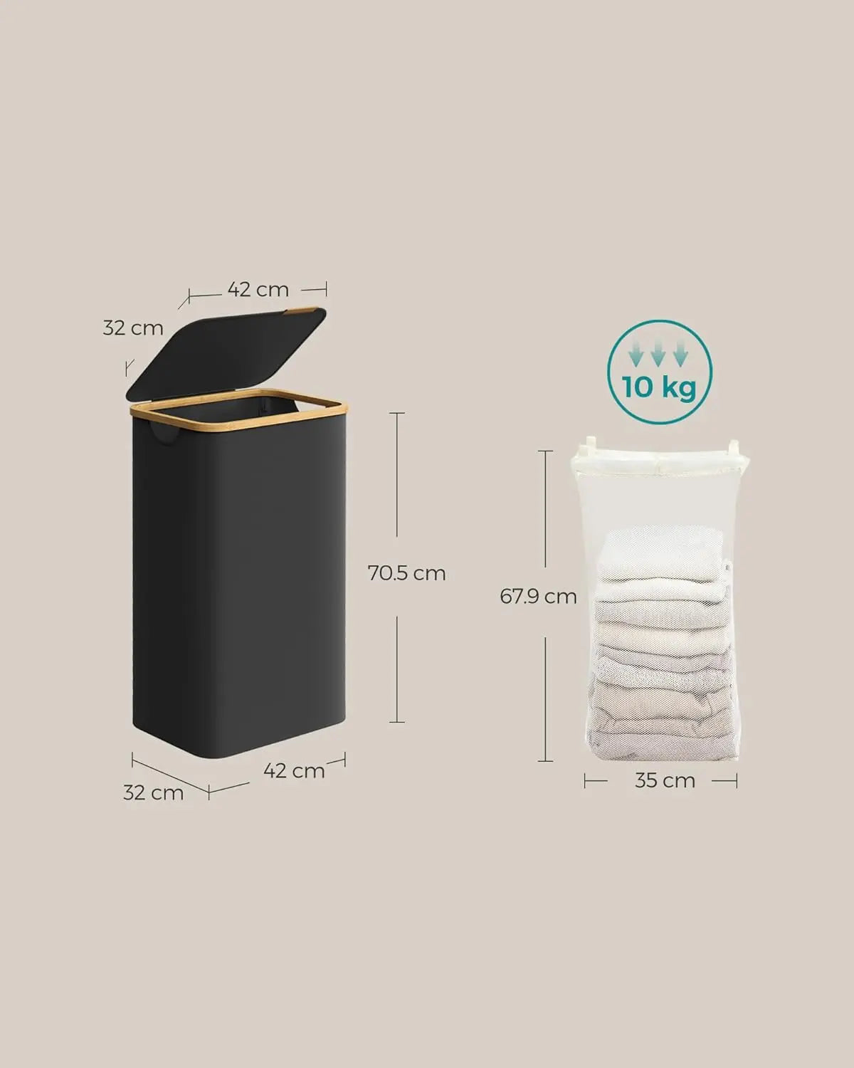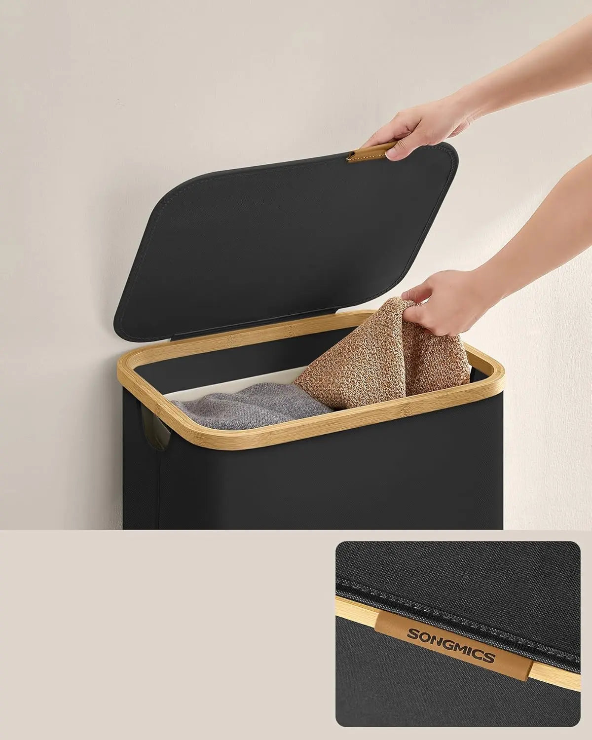Der praktische Deckel schützt nicht nur Ihre Wäsche vor Staub, sondern sorgt auch für mehr Privatsphäre. Das stilvolle Kunstleder-Logo auf dem Deckel dient als eleganter Griff, der das Öffnen zum Kinderspiel macht.