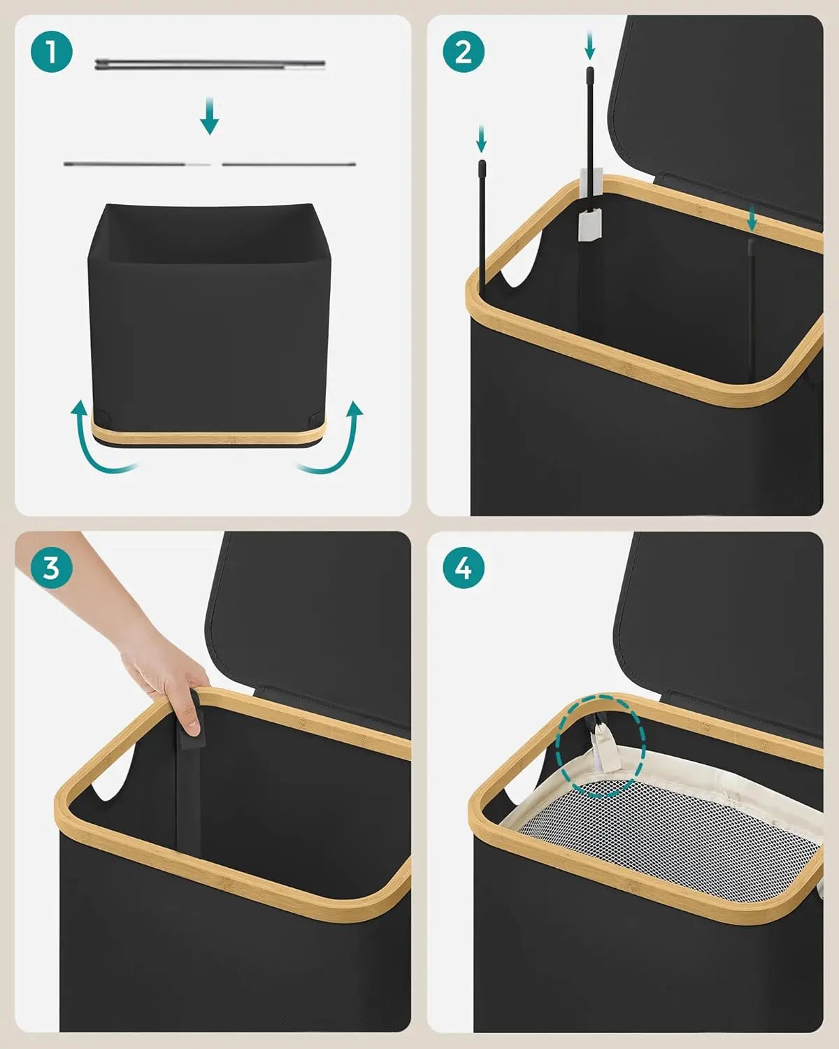 Die Montage ist kinderleicht – mit einer klaren Anleitung und ohne Werkzeug können Sie den Wäschekorb in nur 5 Minuten aufbauen. Machen Sie Ihre Wäschepflege einfacher und stilvoller mit dem SONGMICS Wäschekorb mit Deckel!