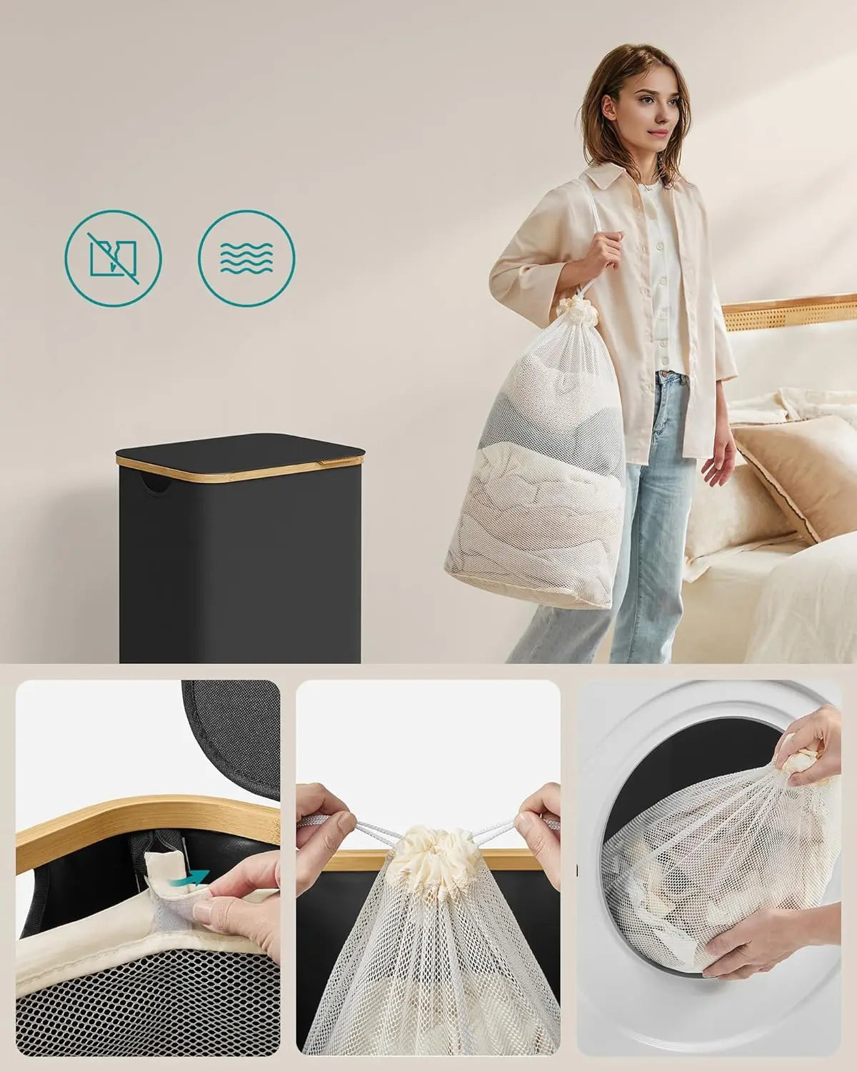 Ein weiteres Highlight ist der herausnehmbare Wäschesack, der mit Klettverschlüssen gesichert ist. Dieser Sack lässt sich mühelos entnehmen und kann dank der Kordelzüge bequem transportiert werden. Das durchdachte Netzdesign macht ihn zudem ideal als Waschbeutel für sortierte Maschinenwäsche.
