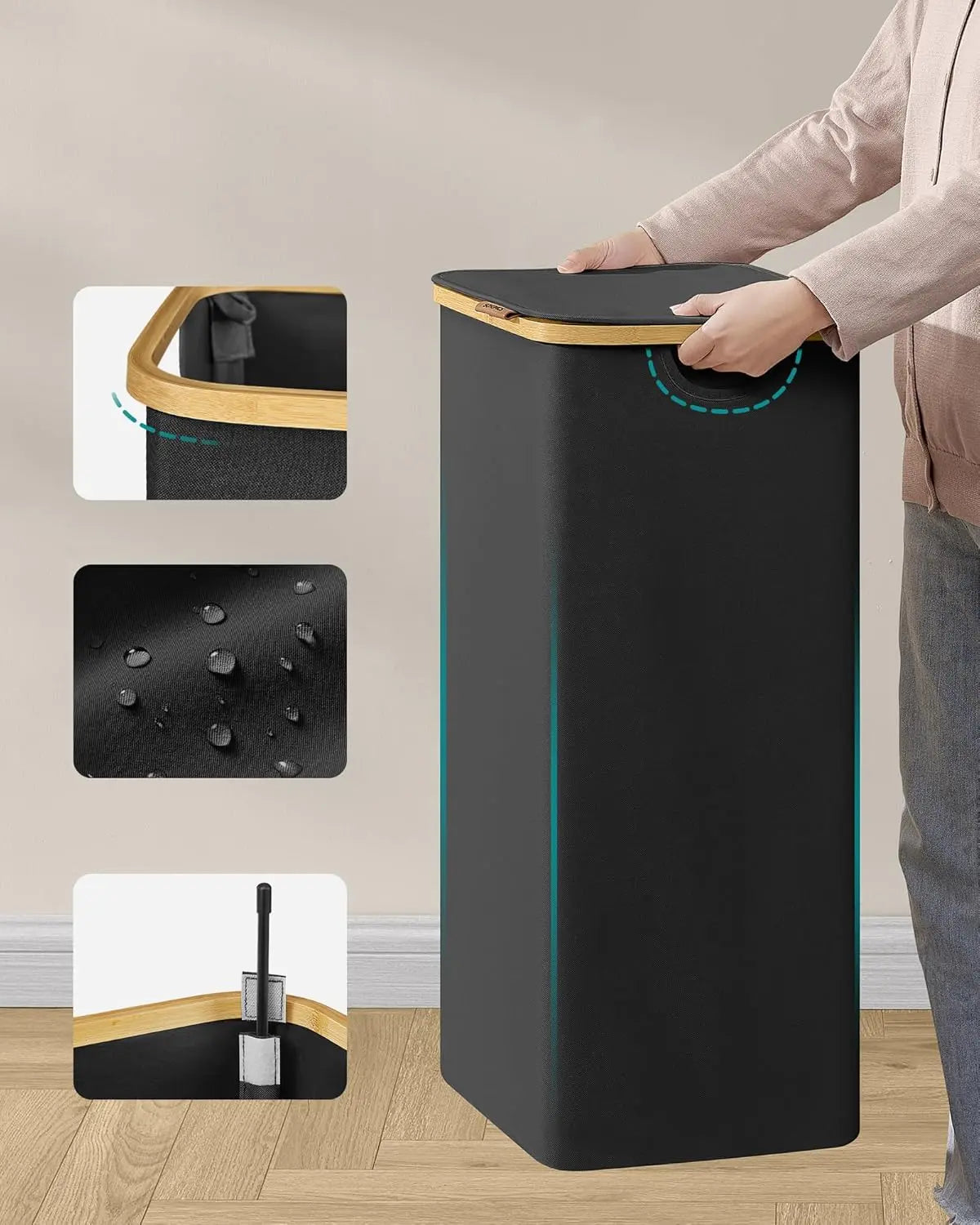 Großes 90‑Liter Fassungsvermögen für Wäsche einer Woche, Herausnehmbarer Wäschesack mit Kordelzug und Klettverschlüssen für einfachen Transport, Deckel schützt vor Staub und bietet Privatsphäre