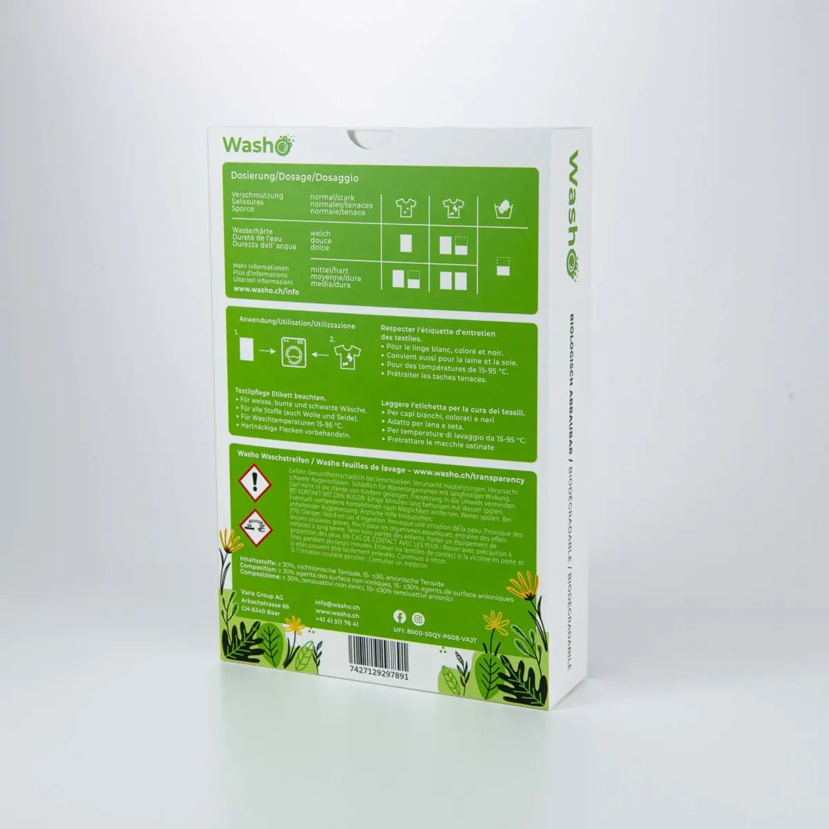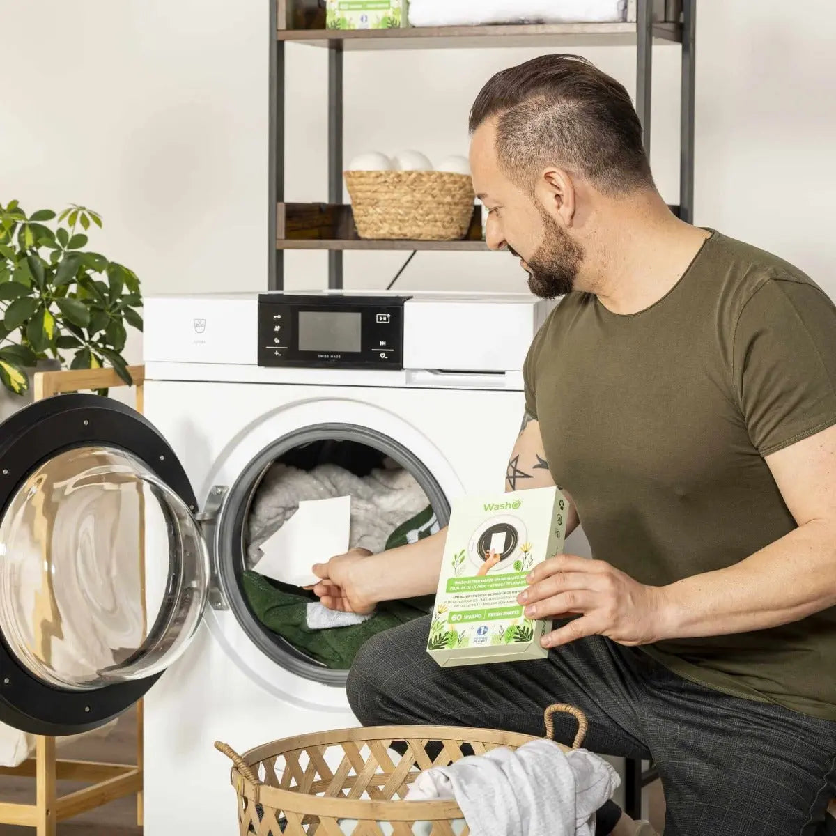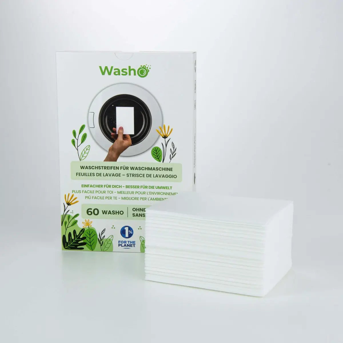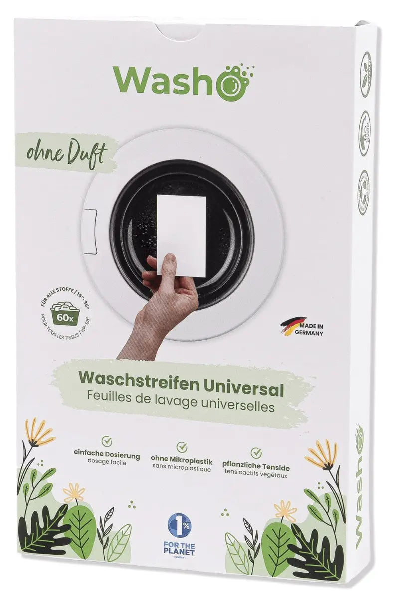 Einfach Washo in die Wäschetrommel legen, Wäsche rein und Programm starten. Der Washo-Waschstreifen löst sich im Wasser komplett auf und sorgt schonend für saubere Wäsche.