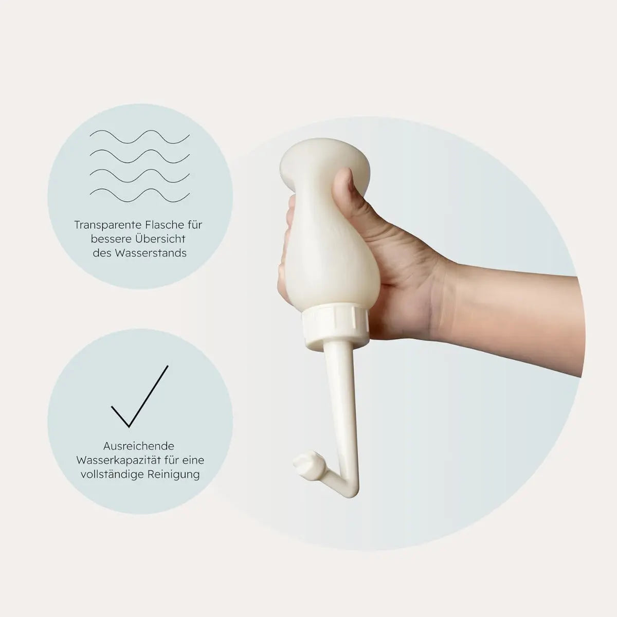Mit einem Fassungsvermögen von 350 ml ermöglicht die handliche Flasche eine vollständige Reinigung, ohne zwischendurch nachfüllen zu müssen. Der ergonomisch abgewinkelte Sprühkopf erlaubt eine gezielte Anwendung im Sitzen – diskret, effizient und komfortabel. Die Intensität des Wasserstrahls lässt sich dabei durch leichten oder kräftigeren Druck auf die flexible Flasche individuell regulieren.