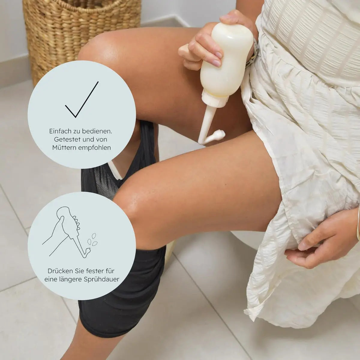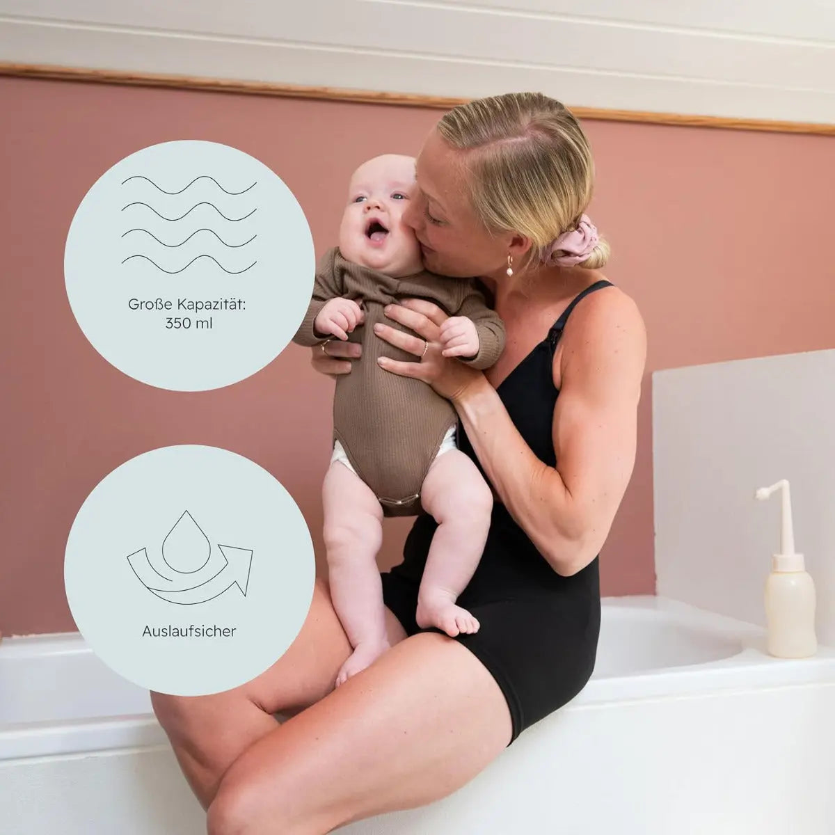 Sanfte Reinigung des Perinealbereichs nach der Geburt, Ergonomischer Sprühkopf für gezielte Anwendung, Auslaufsicheres Design für unterwegs.