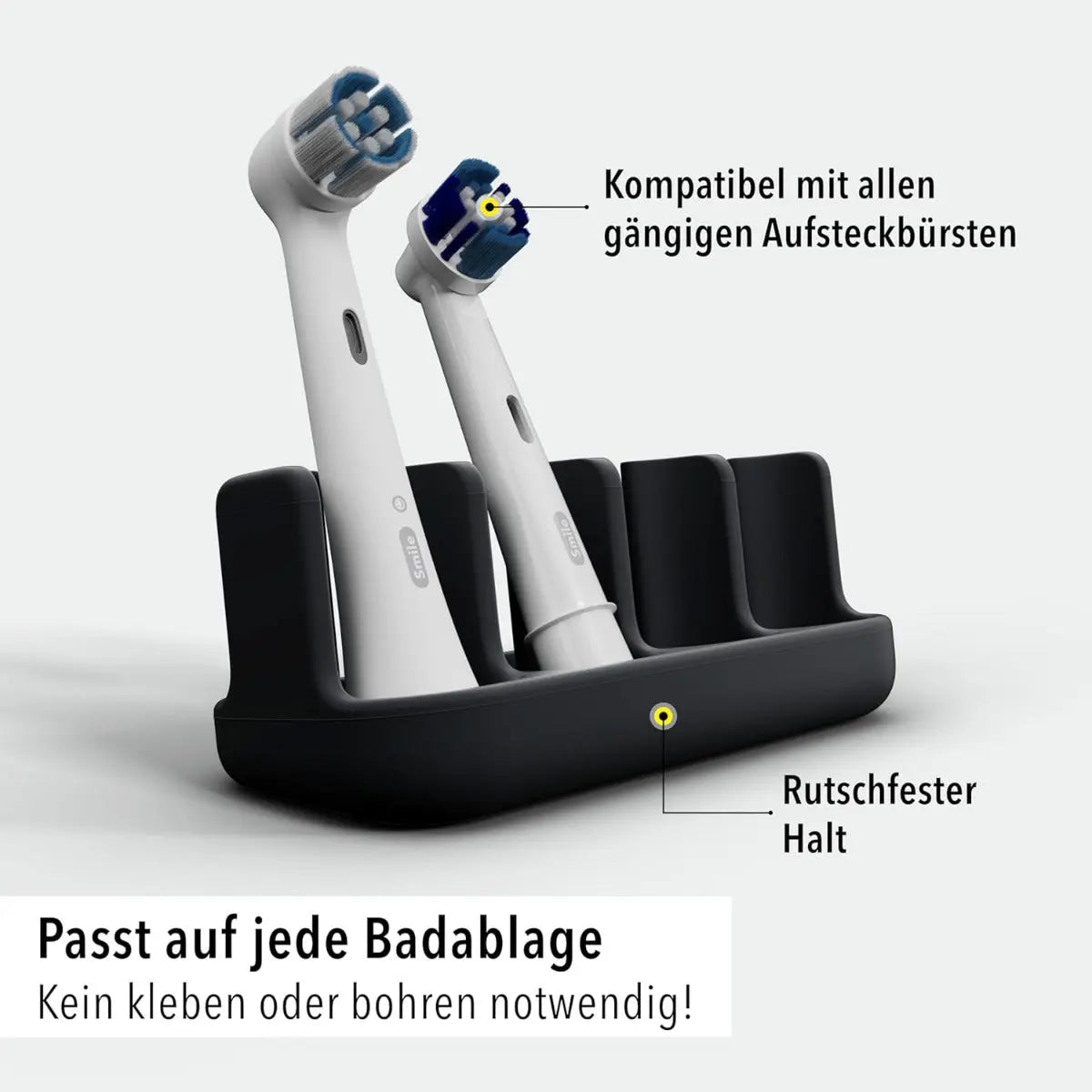 Hygienische Aufbewahrung dank Abfluss-System, Universell kompatibel mit gängigen Aufsteckbürsten, Kompakt und freistehend ohne Bohren