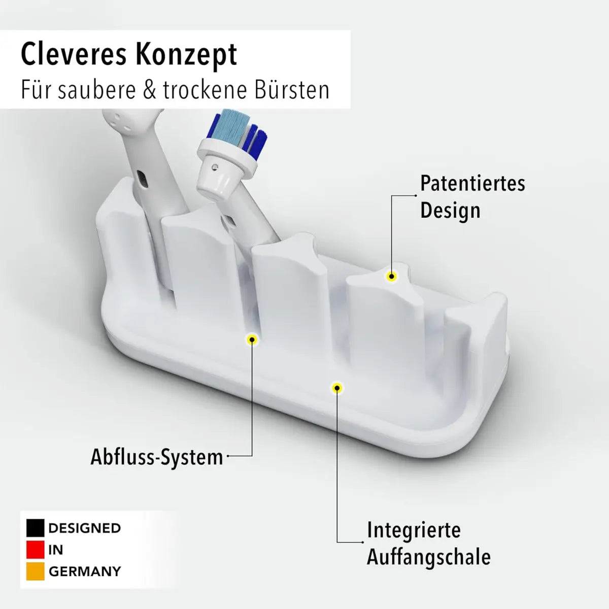 Hygienische Aufbewahrung dank Abfluss-System, Universell kompatibel mit gängigen Aufsteckbürsten, Kompakt und freistehend ohne Bohren