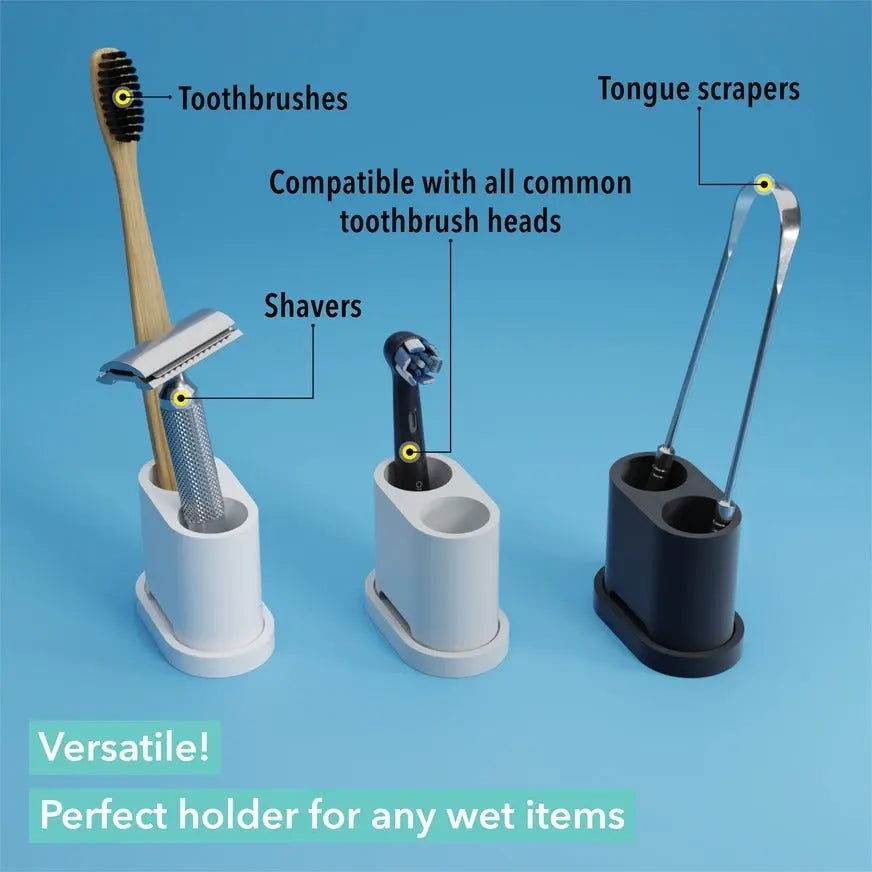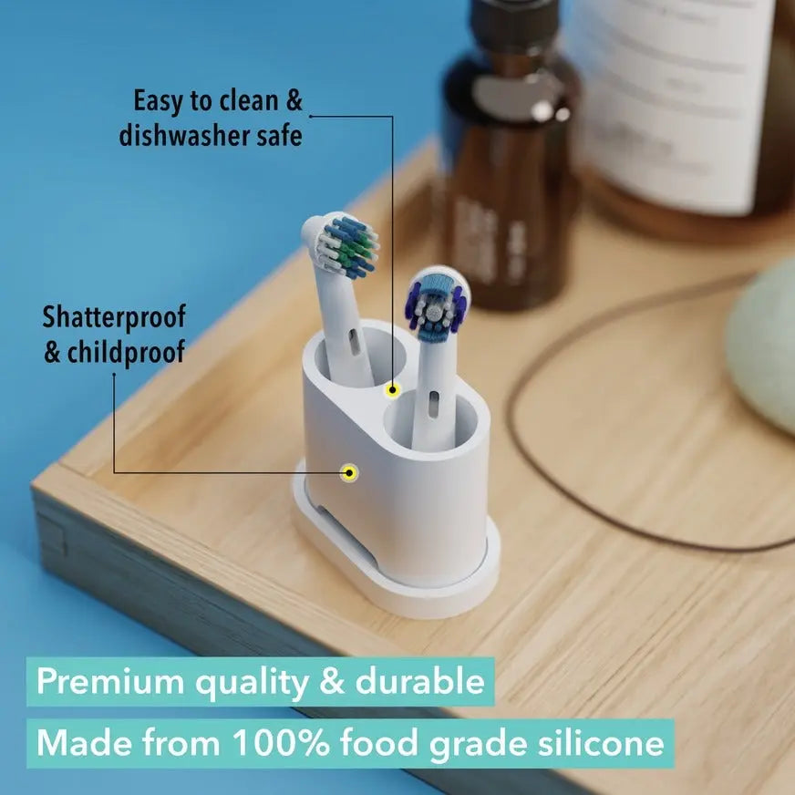Der Halter ist universell kompatibel mit manuellen Zahnbürsten und gängigen elektrischen Aufsteckbürsten – darunter Modelle von Braun Oral-B, Oral-B iO und Philips Sonicare. Zwei Öffnungen mit je 22 mm Durchmesser bieten stabilen Halt, ohne die Bürstenköpfe zu verformen.