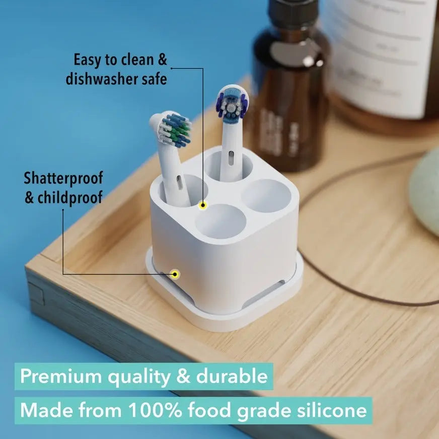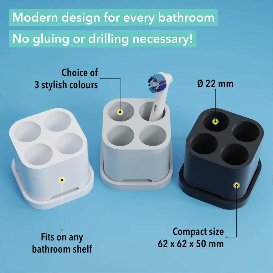 Diese stilvollen Halter zur Aufbewahrung von Aufsteckbürsten und Zahnbürsten sind in den Trendfarben Grau, Weiss und Schwarz erhältlich. Ihr modernes Design fügt sich nahtlos in jedes Badezimmerdekor ein. Hergestellt aus 100% lebensmittelechtem Silikon sind diese Halter äusserst langlebig und hygienisch.