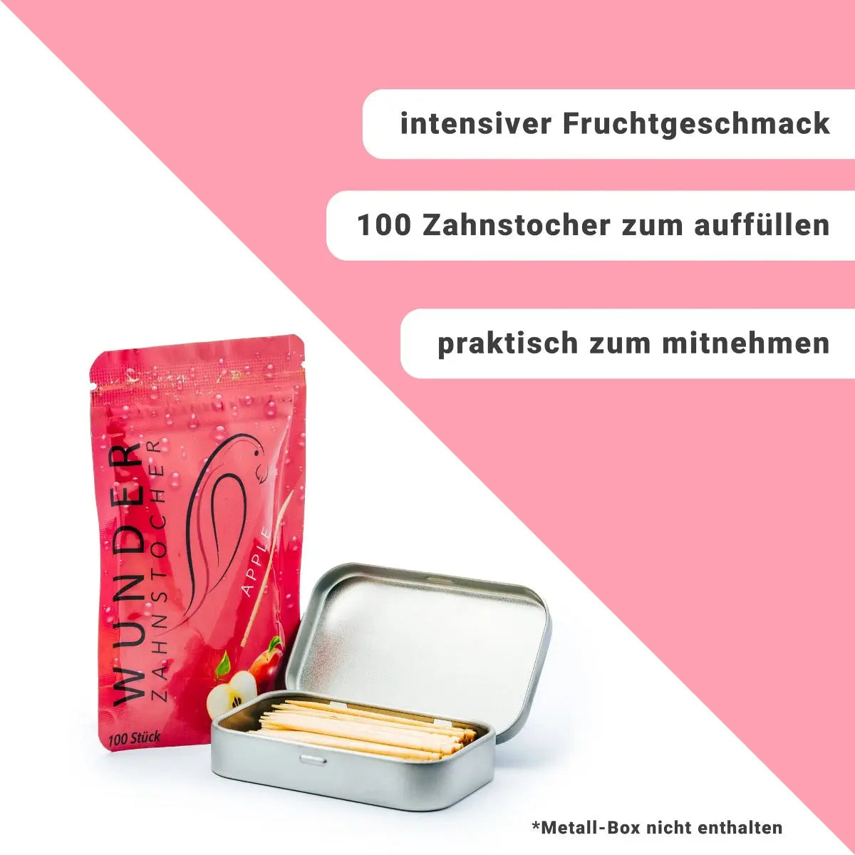 Refill für die Wunder Zahnstocher Metallbox. Zahnstocher mit Apfel Geschmack. Frischer Atem garantiert! Verpackungsinhalt: 100 Zahnstocher. 100% Handmade in Germany! Mit jedem Kauf spendest Du automatisch an unser Wunder-Bienenvolk und leistest dadurch einen wertvollen Beitrag für den Erhalt unseres gesamten Ökosystems! Bestandteile: Birkenzahnstocher, Nat. Lebensmittelaroma, Glycerin, Süßungsmittel.