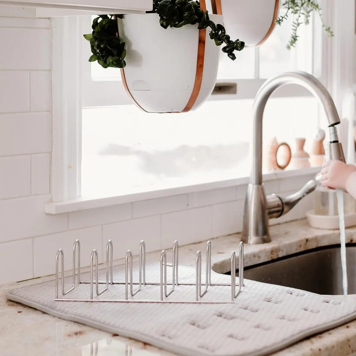 - SHAPE-SHIFTER ABTROPFGESTELL: Sie können dieses Zwei-in-Eins-Abtropfgitter auf zwei Arten verwenden. Entweder nur als Trockenmatte ohne Gestell oder Sie schieben das Gestell in die Matte und Sie haben ein Trockengestell für Teller oder anderes sauberes Geschirr