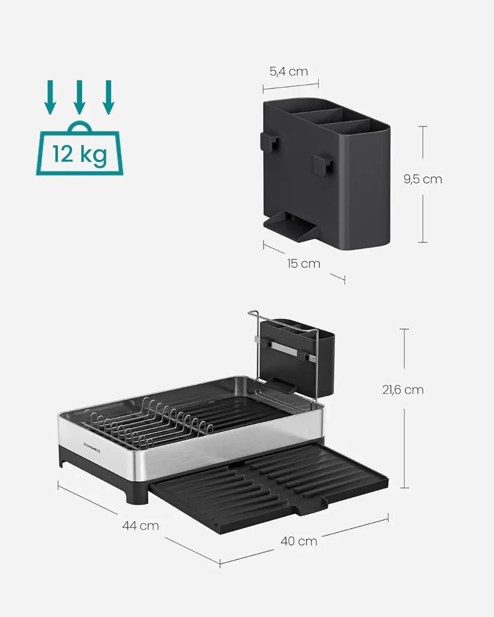 Gefertigt aus rostfreiem Edelstahl ist das Gestell nicht nur langlebig, sondern auch stabil – mit einer Tragkraft von bis zu 12 kg. Es bietet Platz für 9 Teller, 8 Tassen, 8 Schüsseln und über 25 Besteckteile, die bequem im separat integrierten Utensilienhalter verstaut werden können. Die leicht geneigte Abtropfschale mit Rillen sorgt dafür, dass überschüssiges Wasser direkt in die Spüle abläuft – für eine stets trockene Arbeitsplatte.