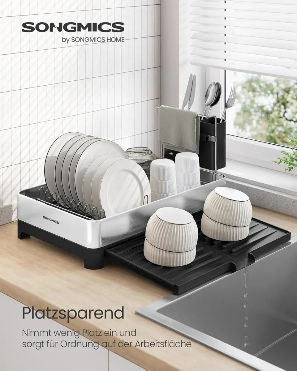 SONGMICS Abtropfgestell – erweiterbar, mit Utensilienhalter, Edelstahl, silbern-schwarz, rostfrei, für Teller, Schüsseln, Besteck und Tassen