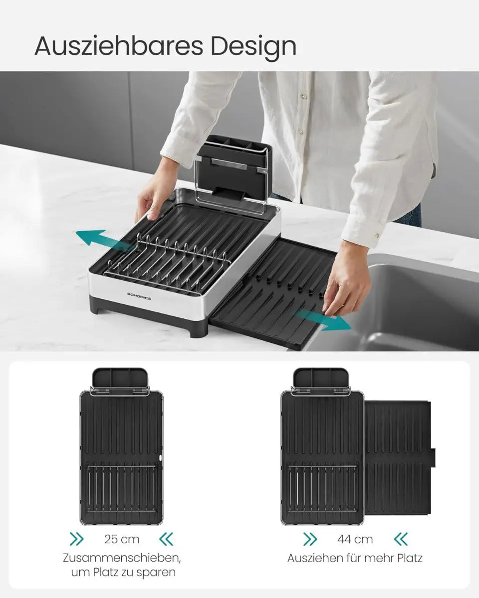 Besonders praktisch: Die Auffangschale lässt sich ausziehen, um noch mehr Fläche für grösseres Geschirr oder Töpfe zu schaffen, und kann bei Nichtgebrauch wieder kompakt zusammengeschoben werden. Die Montage erfolgt in nur zwei einfachen Schritten – schnell, unkompliziert und ohne Werkzeug. SONGMICS liefert damit eine funktionale Lösung für mehr Ordnung in deiner Küche – auch auf kleinstem Raum.