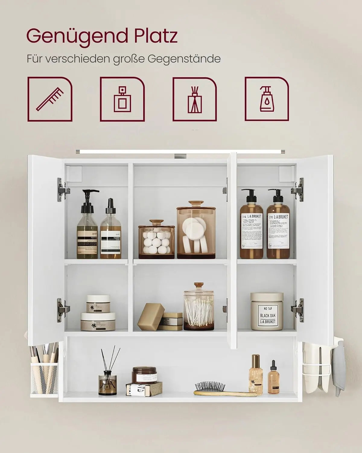 Ein Highlight des Spiegelschranks ist die integrierte Lichtleiste im oberen Bereich. Diese sorgt dafür, dass Sie sich optimal im Spiegel sehen können – ideal für Ihre tägliche Hautpflege und Make-up-Routine. Verstecken Sie Ihre persönlichen Gegenstände hinter den eleganten Spiegeltüren und geniessen Sie die schlichte Schönheit, die dieser Schrank Ihrem Badezimmer verleiht.